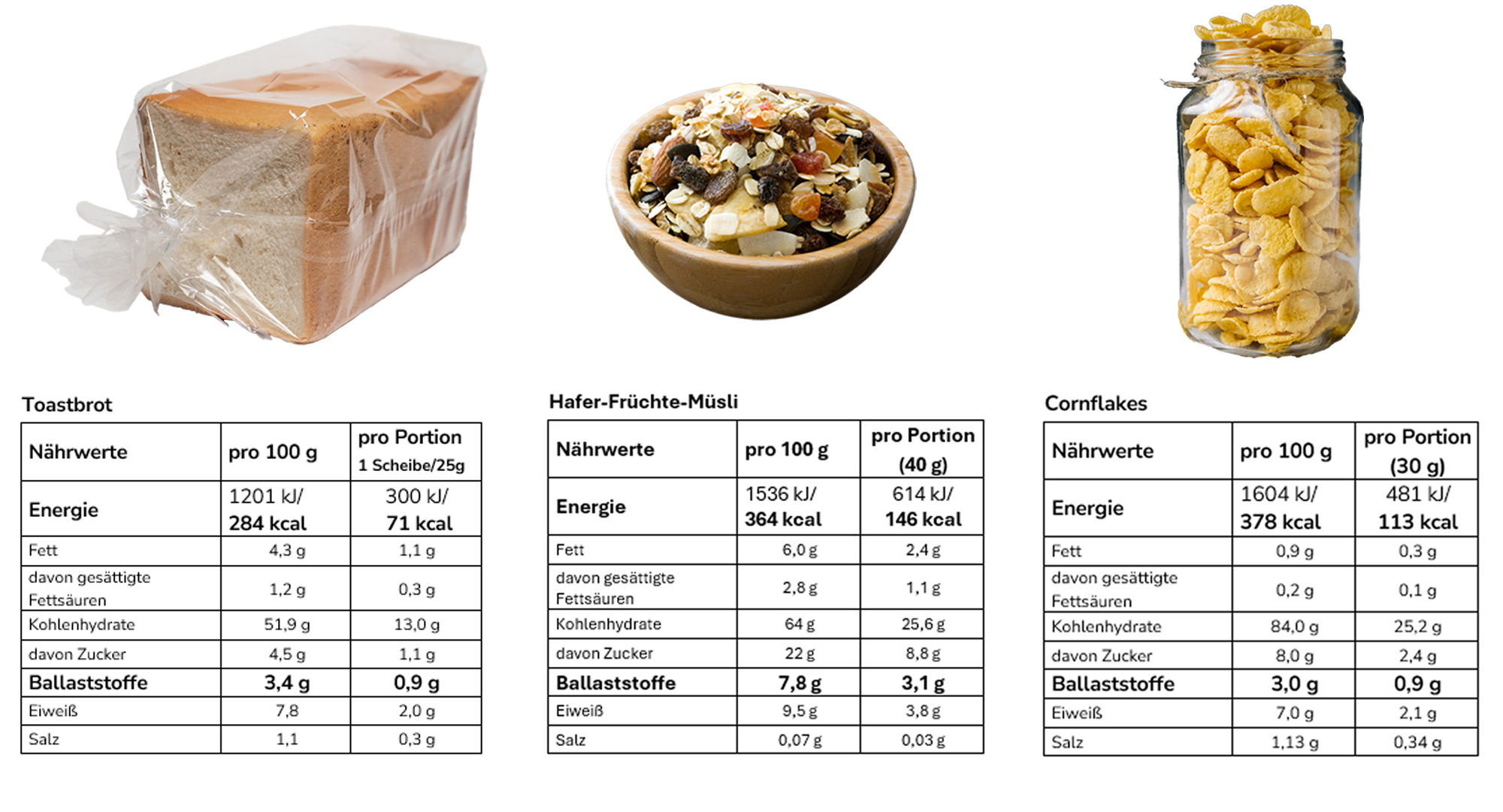 Aus Sicht von Lebensmittelklarheit ist diese Voraussetzung beim Toastbrot und bei den Cornflakes nicht erfüllt. Die Europäische Behörde für Lebensmittelsicherheit empfiehlt 25 Gramm Ballaststoffe am Tag. Üblicherweise wird eine signifikante Menge für Nährstoffe mit 15 Prozent der empfohlenen Tagesmenge angesetzt. Das wären 3,75 Gramm Ballaststoffe. Diese Menge erreichen Toastbrot und Cornflakes nicht: Die auf den Verpackungen angegebenen Portionsgrößen liefern deutlich weniger Ballaststoffe . Selbst bei größer angesetzten Verzehrsmengen wie 2 bis 3 Scheiben Toast oder 50 Gramm Cornflakes ist die Ballaststoffmenge nicht ausreichend.
