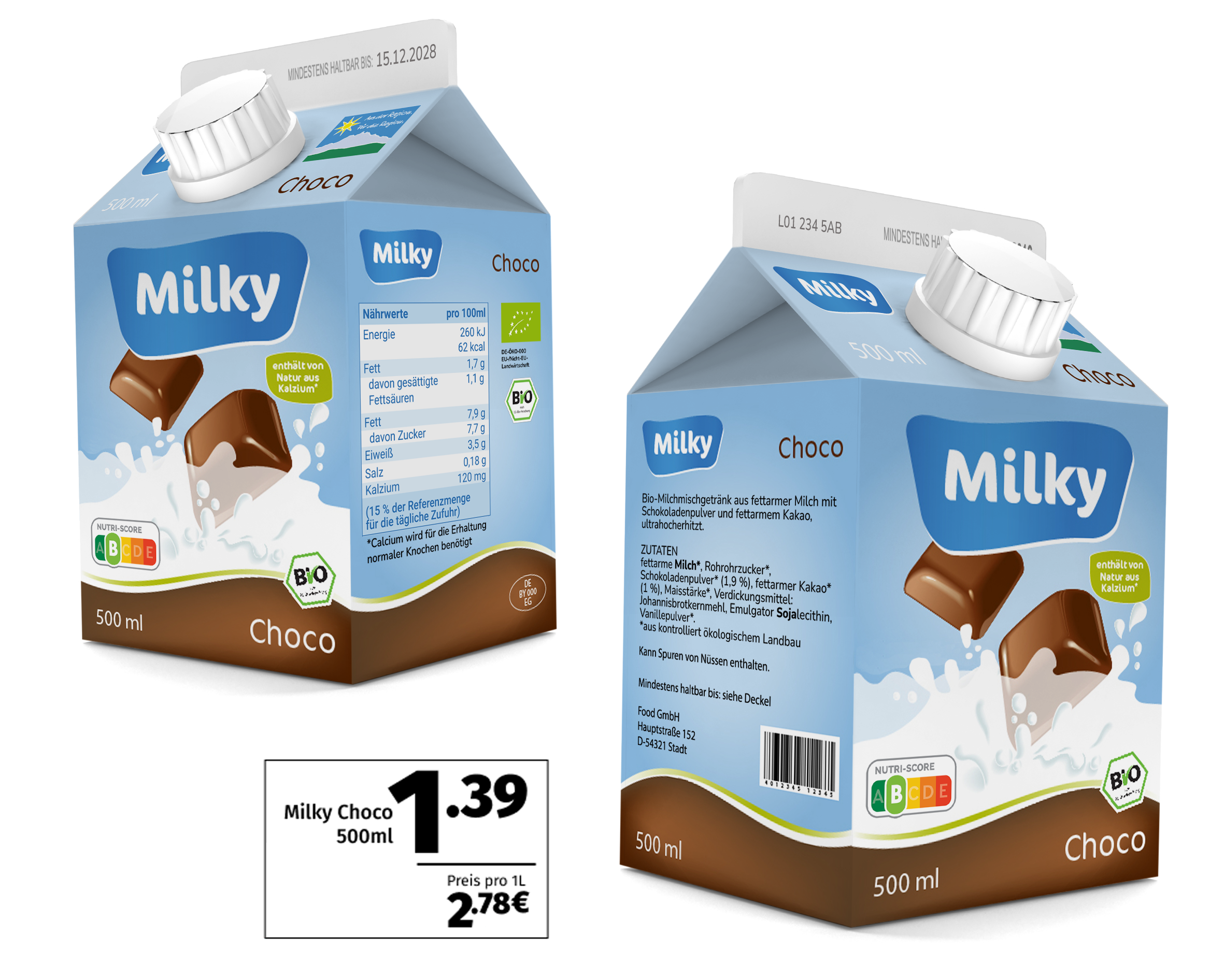 Am Beispiel des imaginären Produkts "Milky Choco" zeigen wir, welche Kennzeichnungen ein Produkt haben sollte und welche zusätzlichen Kennzeichnungen es gibt. Alle Kennzeichnungen sind unten nacheinander aufgelistet und beschrieben. Es wird jeweils ein Beispielbild für die Kennzeichnung gezeigt.