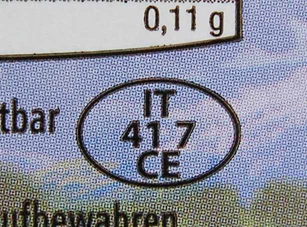 Das Identitätskennzeichen IT 41 7 CE weist auf Italien hin. Anhand der Betriebsnummer kann der konkrete Standort in Italien ermittelt werden, der in diesem Fall in Bozen liegt. Das Allgäu liegt mehr als 200 Kilometer vom Abfüllort entfernt.