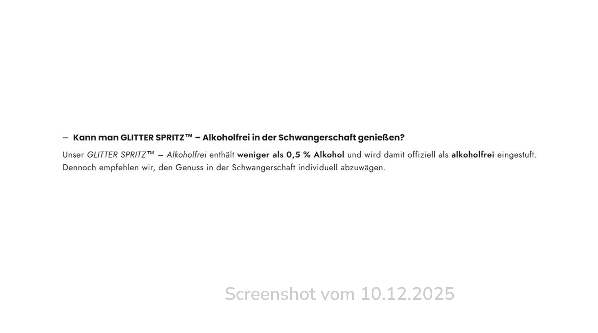 Im Online-Shop Flaschenpostgin.de der Anbieterfirma Craft Circus steht in der Produktbeschreibung „Alkoholgehalt: weniger als 0,5 % vol“. Bei den FAQs lautet die Antwort auf die Frage, ob man das Getränk in der Schwangerschaft genießen kann: „Unser Glitter Spritz™ – Alkoholfrei enthält weniger als 0,5 % Alkohol und wird damit offiziell als alkoholfrei eingestuft. Dennoch empfehlen wir, den Genuss in der Schwangerschaft individuell abzuwägen.“