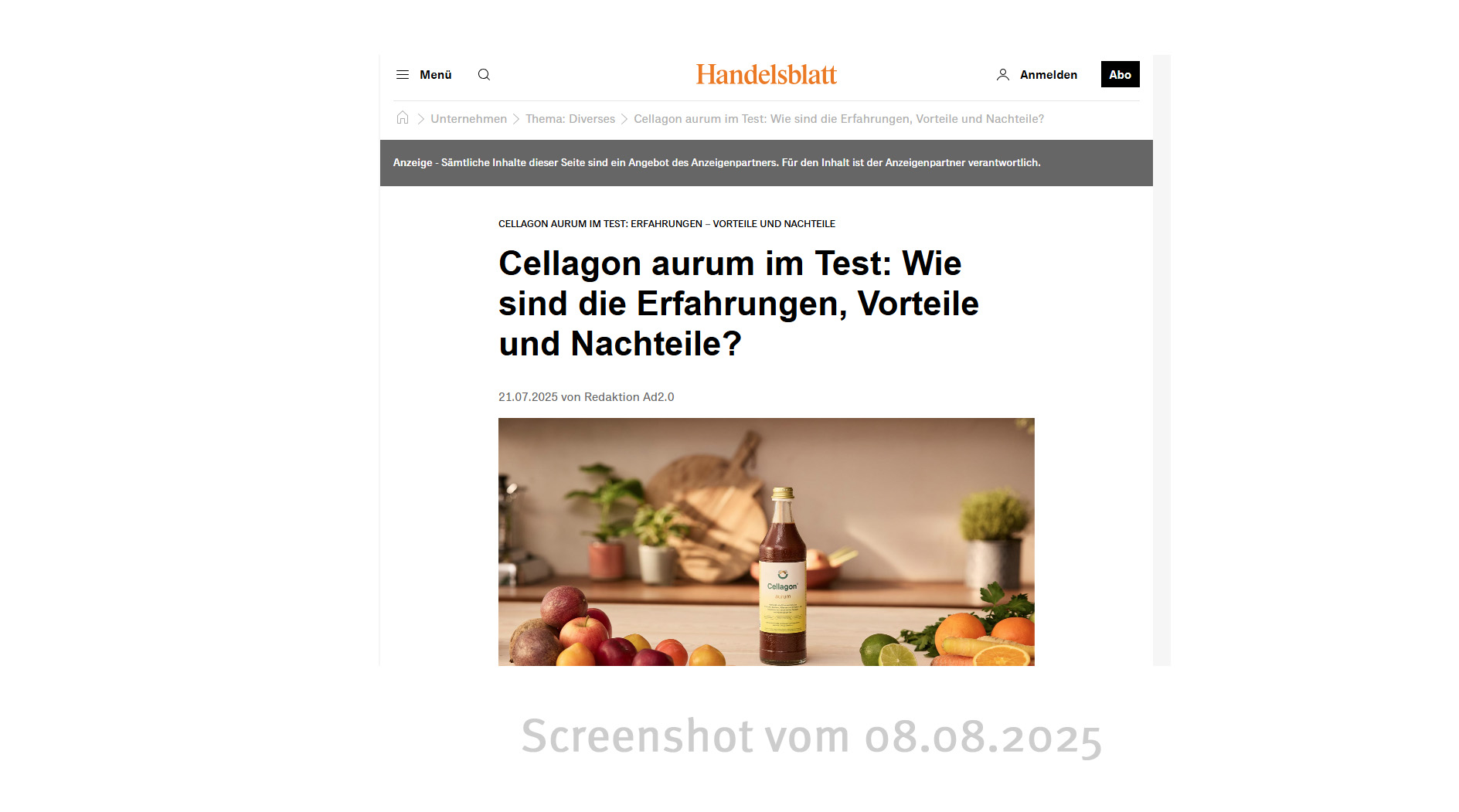 Unter dem Titel „Cellagon aurum im Test: Wie sind die Erfahrungen, Vorteile und Nachteile?“ bewirbt die Cellagon GmbH in einer Online-Anzeige ihr Produkt. Zu den Vorteilen zählt die Firma das „attraktive Preis-Leistungs-Verhältnis“ und erklärt: „Mit einem Preis von 52,90 Euro pro Flasche, die für rund 50 Portionen reicht, kostet eine Tagesdosis 1,06 Euro.“