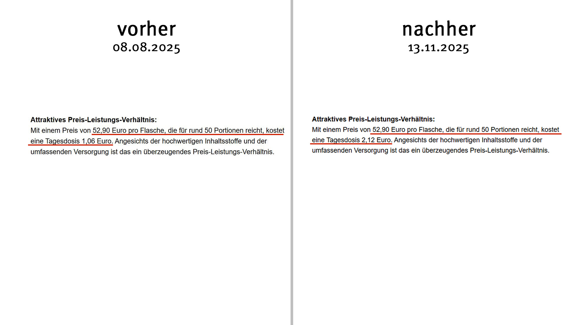 Das „attraktive Preis-Leistungsverhältnis“ entspricht eher einem „Preis-Leistungs-Wirrwarr“. Mit den Angaben in der Anzeige können Leser:innen davon ausgehen, dass die Tagesdosis 1,06 Euro kostet und die Flasche für 50 Tage reicht. Das ist aber nicht der Fall. Die Tagesportion kostet das Doppelte und die Flasche reicht auch nur für 25 Tage.