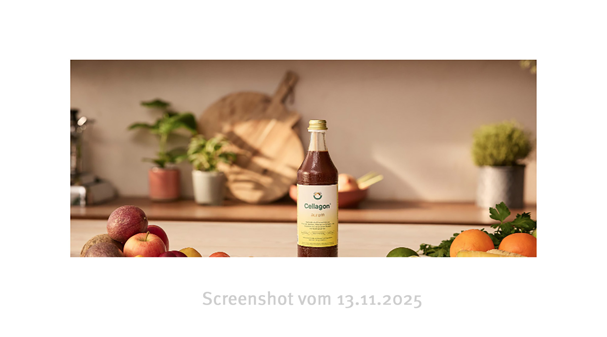 Auch auf Cellagon.de kostet die Flasche Cellagon aurum 52,90 Euro. Weitere Angaben sind „1,06 € pro Glas“ sowie 25 Tagesportionen.