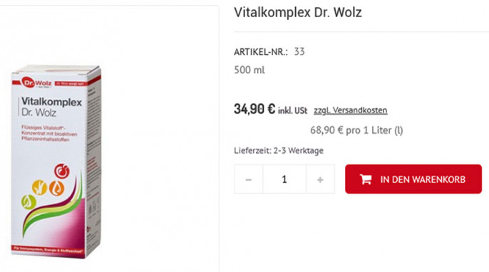 - „Vitalkomplex Dr. Wolz ist ein wissenschaftlich getestetes Mikronährstoffkonzentrat mit einer breiten Palette an Mineralstoffen, Vitaminen und Spurenelementen sowie vielen Sekundären Pflanzenstoffen aus Obst und Gemüse.“