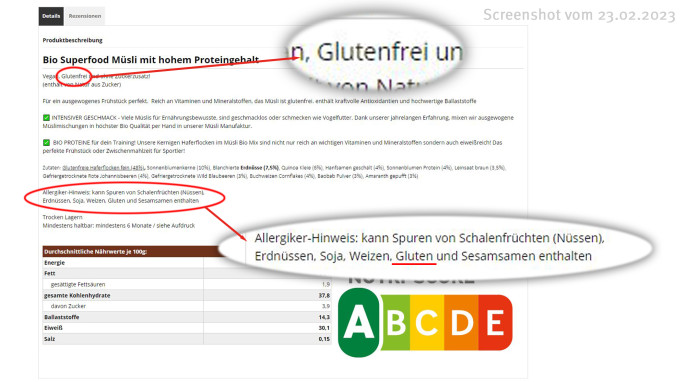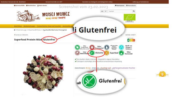 Der Anbieter muesli-muehle.de bewirbt das „Superfood Protein Müsli“ mehrfach als „glutenfrei“ und weist mit dem Hinweis „kann Spuren von Schalenfrüchten (Nüssen), […], Gluten und Sesamsamen enthalten“ auf das Vorhandensein von Spuren von Gluten hin.