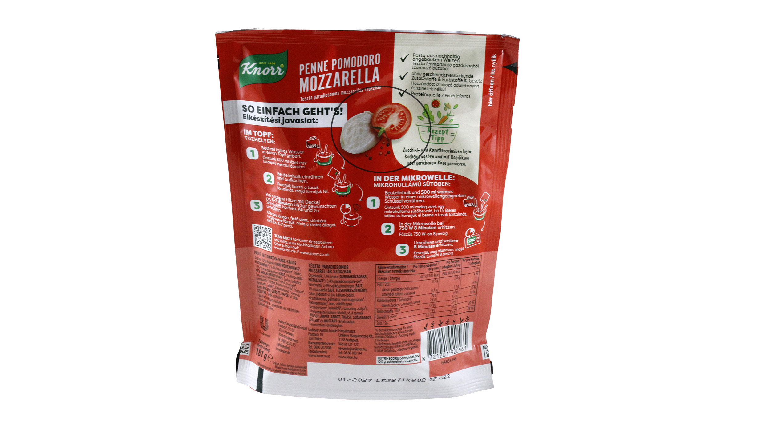 Das Knorr Fertiggericht nennt Mozzarella im Produktnamen und hebt ihn durch die Schriftgröße deutlich hervor. Dies und der abgebildete Mozzarella auf der Rückseite lassen Mozzarella in wertgebender Menge erwarten. Aus der Zutatenliste geht jedoch hervor, dass der Hersteller Schmelzkäsepulver für das Fertiggericht verwendet. Dieser wird wiederum hauptsächlich aus anderem Käse hergestellt und nur zu etwa einem Drittel aus Mozzarella. Damit müssen Verbraucher:innen nicht rechnen.