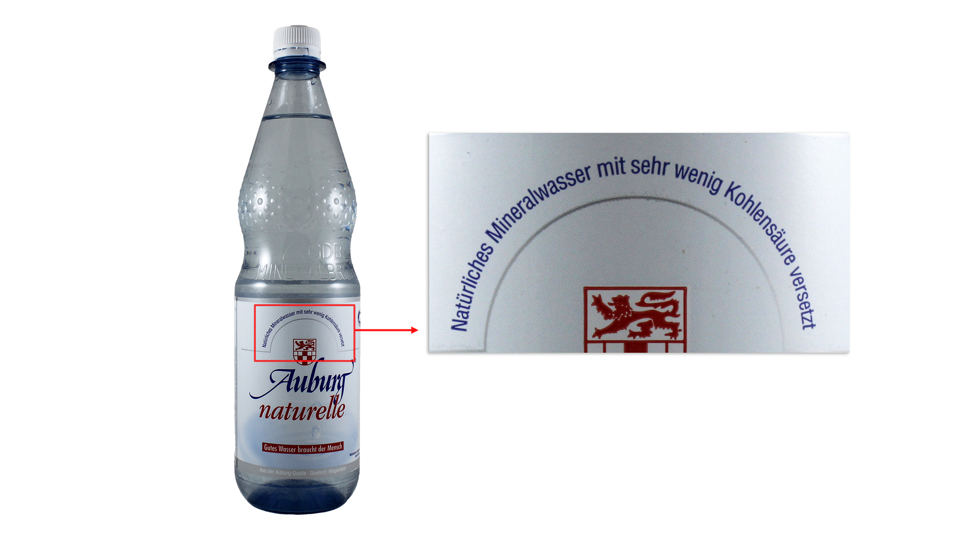 Auf dem Etikett der Schauseite des Mineralwassers springt mittig in großer Schrift der Produktname „Auburg naturelle“ ins Auge. Darunter steht sehr viel kleiner „Gutes Wasser braucht der Mensch“ und darüber noch viel kleiner geschrieben halbkreisförmig die Bezeichnung „Natürliches Mineralwasser mit sehr wenig Kohlensäure versetzt“.