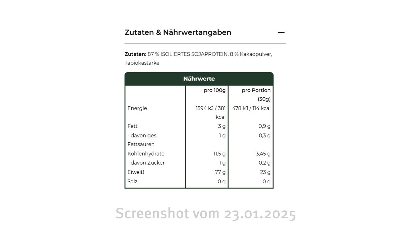 Die Vetain GmbH bietet in ihrem Online-Shop eine Reihe von Produkten an, darunter Proteinpulver und Toppings wie „Soja Protein Crispies“ und Kokoschips. Im oberen Bereich der Angebotsseiten sind jeweils das EU-Bio-Siegel sowie das deutsche Bio-Siegel abgebildet. Tatsächlich stammt nur ein Teil der angebotenen Produkte aus ökologischer Erzeugung. Das Zutatenverzeichnis der „Soja Protein Crispies“ enthält keinen Bio-Hinweis. Bei den Kokoschips und den Erdbeerscheiben handelt es sich jeweils um Bio-Lebensmittel.