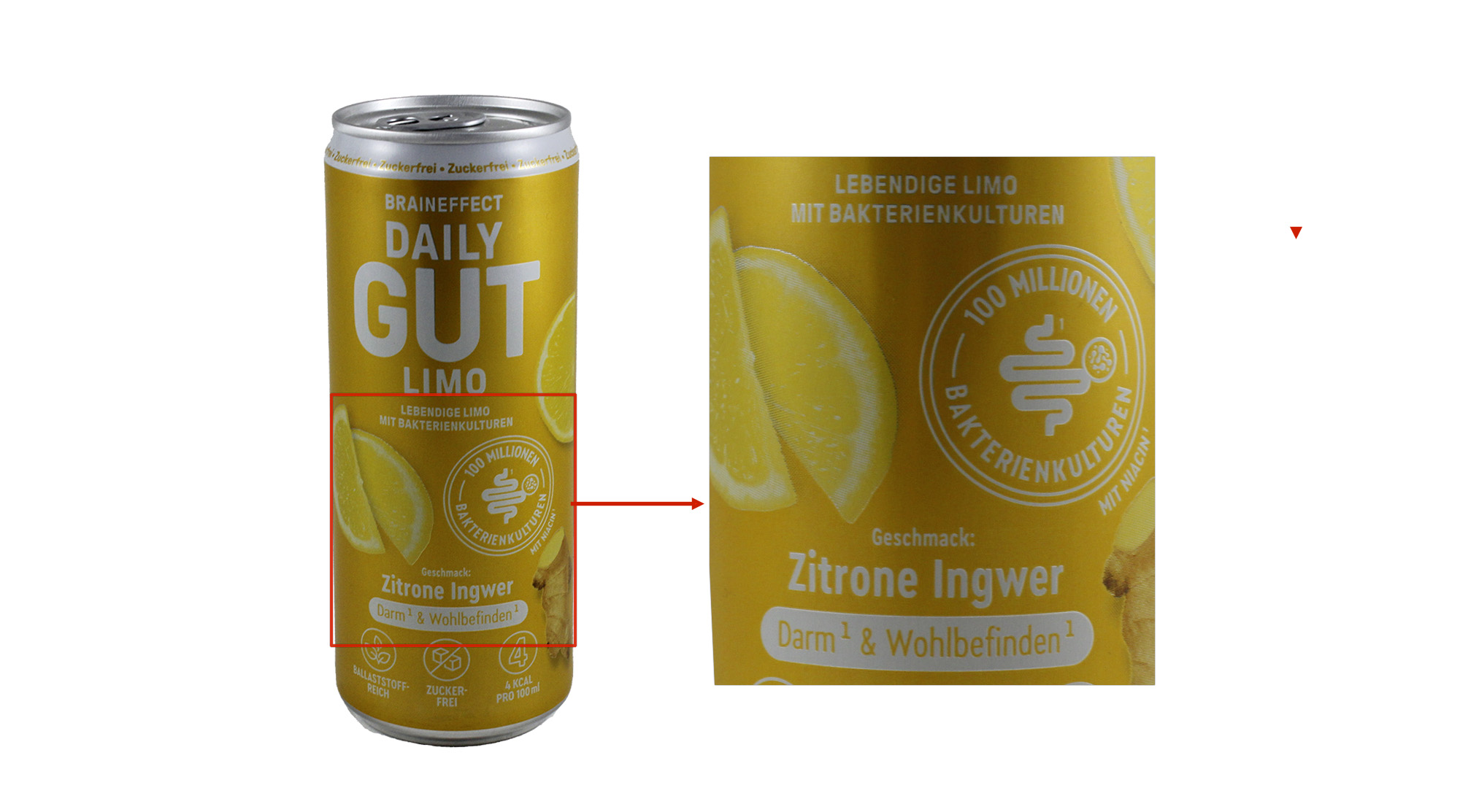 Der Name „Daily Gut Limo“ suggeriert, dass das Getränk speziell für den Darm bestimmt sei. Denn „Gut“ bedeutet in Deutsch „Darm“ und es wird durch die Gesamtaufmachung des Produkts – insbesondere durch das abgebildete Darm-Symbol und den Claim „Darm & Wohlbefinden“ – deutlich, dass „Gut“ hier nicht im Sinne von „gut“ gemeint ist, sondern den Darm anspricht. Der Claim „Darm & Wohlbefinden“ suggeriert insgesamt, dass die „Braineffect Daily Gut Limo“" das Wohlbefinden des Darms fördert.