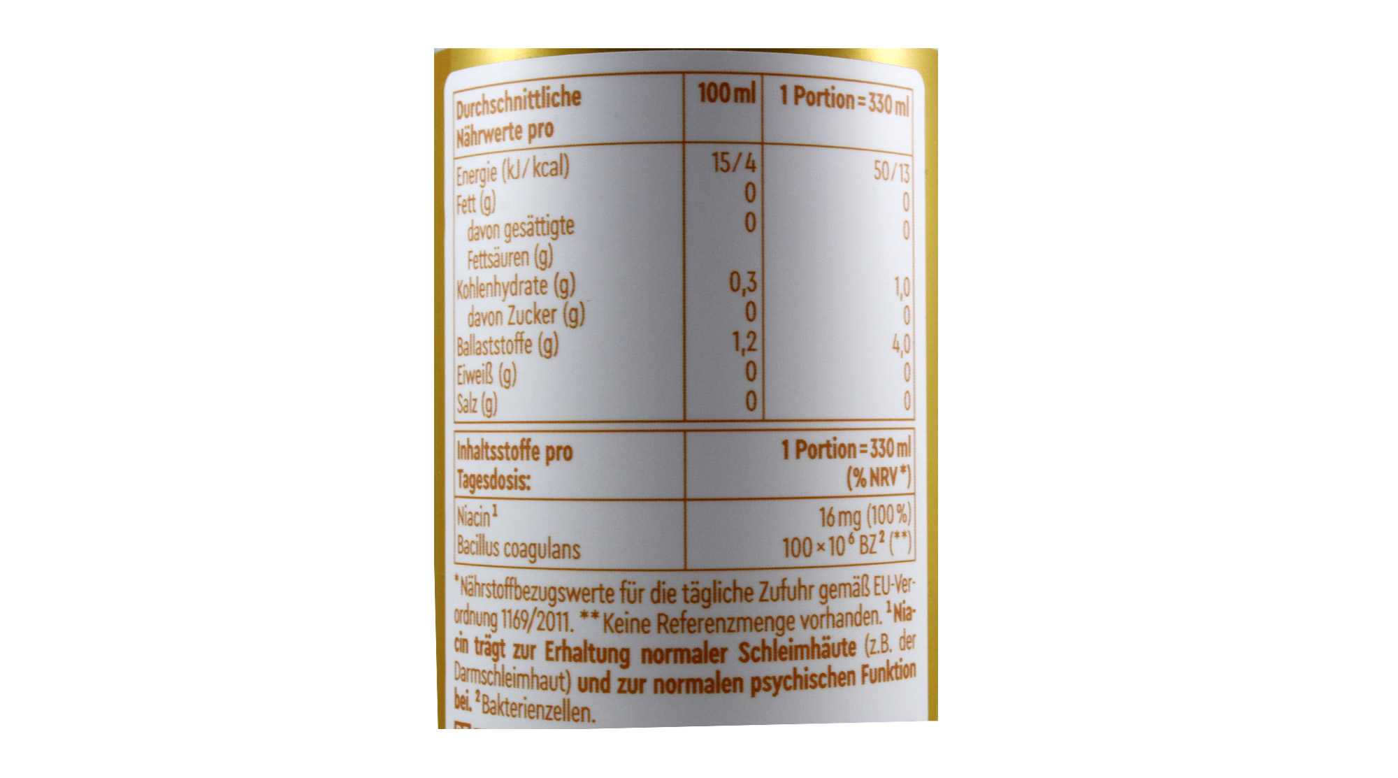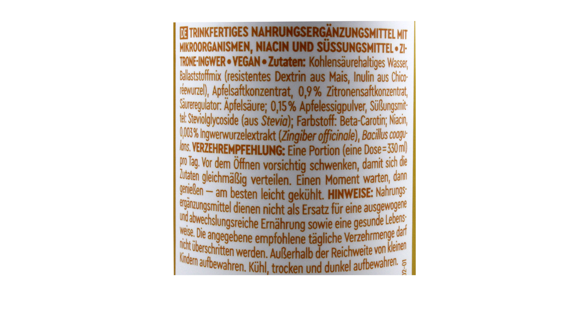 Bei dem Produkt handelt es sich laut Anbieter um ein „trinkfertiges Nahrungsergänzungsmittel mit Mikroorganismen, Niacin und Süßungsmittel“. Weitere Zutaten laut Zutatenliste sind unter anderem: Kohlensäurehaltiges Wasser, Ballaststoffmix (resistentes Dextrin aus Mais, Inulin aus Chicoréewurzel), Konzentrate aus Apfel- und Zitronensaft sowie 0,15 % Apfelessigpulver und Ingwerwurzelextrakt.