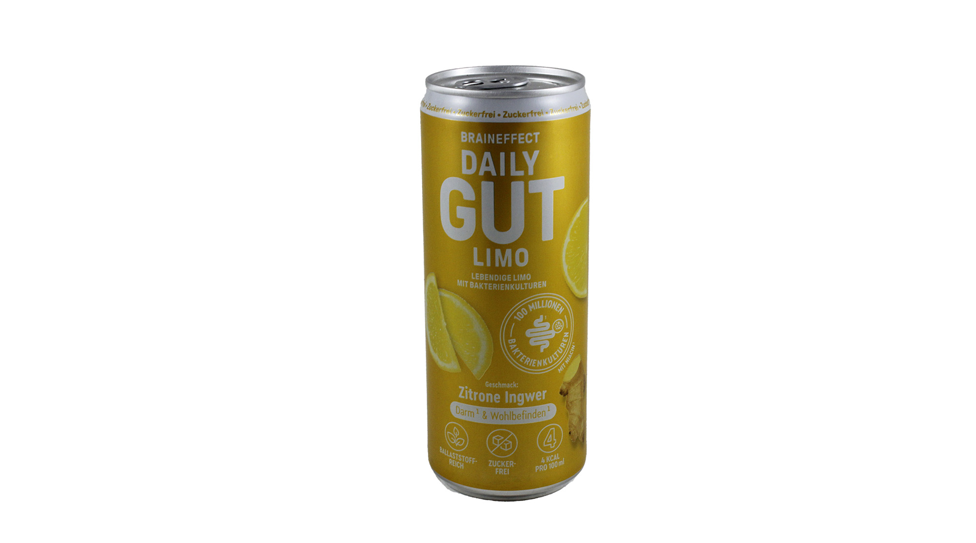 Auf der Schauseite der Getränkedose „Braineffect Daily Gut Limo“ finden sich folgenden Hinweise: