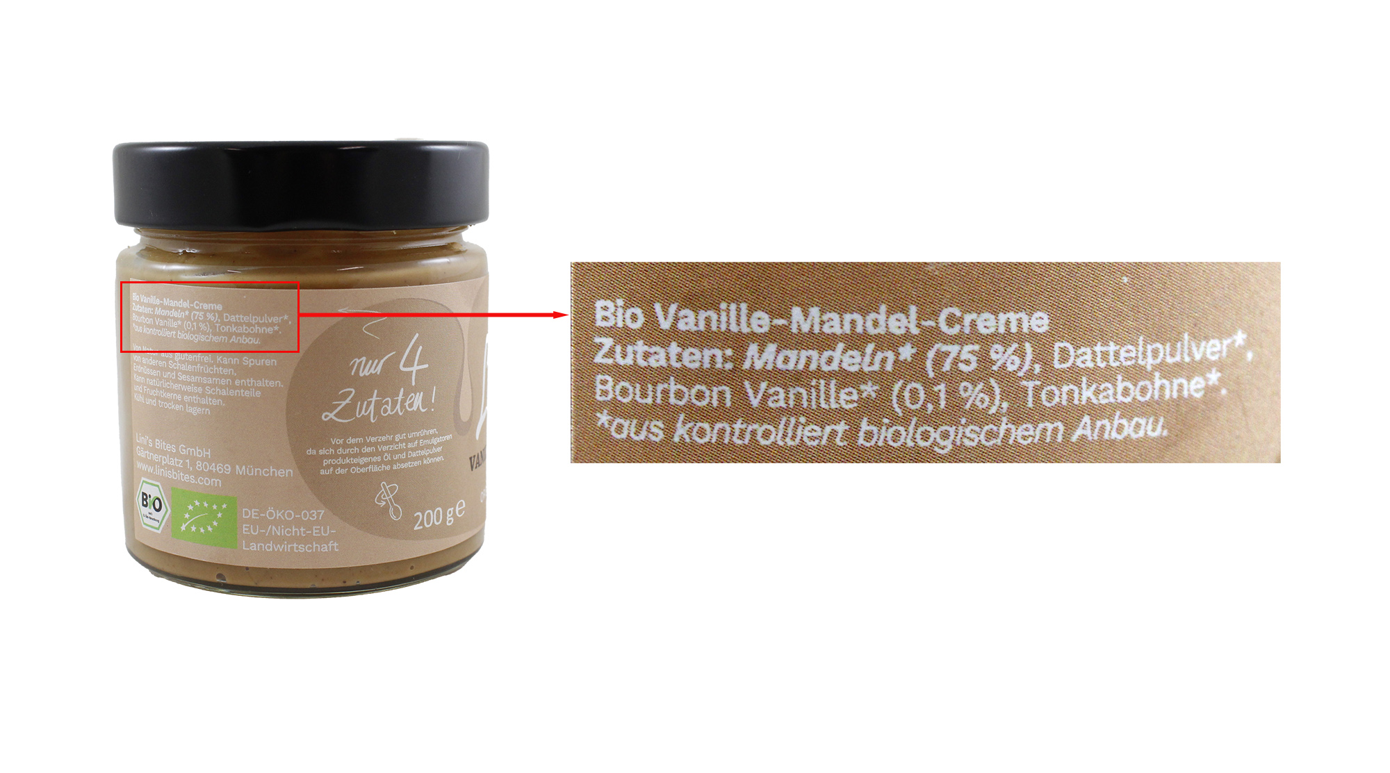 Der Anbieter Lini’s Bites bietet ein Produkt mit dem Namen „Vanilla Allmond Cookie Spread“ an. Zusätzlich wirbt das Etikett mit „nur 4 Zutaten“. Die Zutatenliste auf der Rückseite listet Mandeln (75 %), Dattelpulver, Bourbon-Vanille (0,1 %) und Tonkabohne auf. „Cookies“ oder Zutaten, die für die Herstellung von Cookies benötigt werden, enthält die Zutatenliste nicht. Die Bezeichnung lautet „Bio Vanille-Mandel-Creme“.