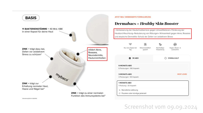 Die Werbung für den „Dermabacs – Healthy Skin Booster“ vermittelt eine Erwartung an das Produkt, die es nicht halten kann: Die Kapseln mit elf Bakterienstämmen und Zink sollen Hauterkrankungen wie Akne und Neurodermitis mildern und auch das Immunsystem verbessern. Die Firma Mybacs hat einzelne Aussagen auf der Website entfernt. Unverändert wirbt sie jedoch mit den positiven Auswirkungen auf Akne und Neurodermitis für die Kapseln.