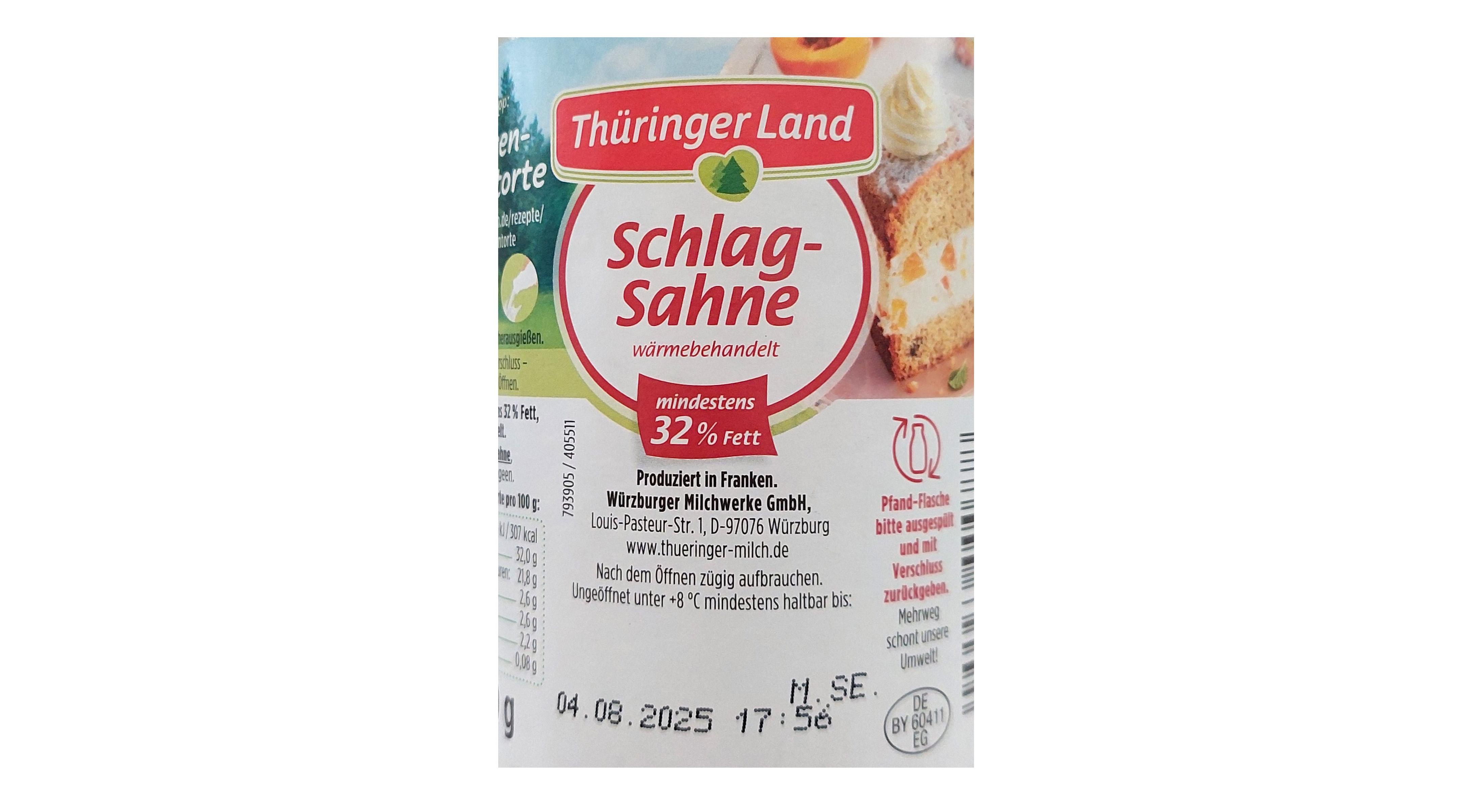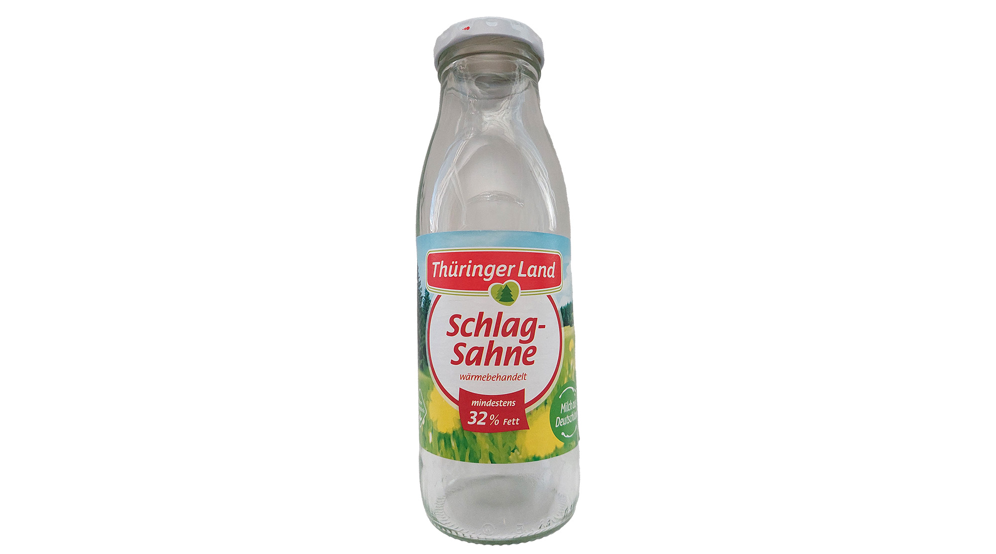 Auf der Schauseite der Flasche mit Schlagsahne steht rot unterlegt „Thüringer Land“, ebenso auf dem Deckel. Am rechten unteren Rand des Etiketts steht vor grünem Hintergrund „Milch aus Deutschland“.