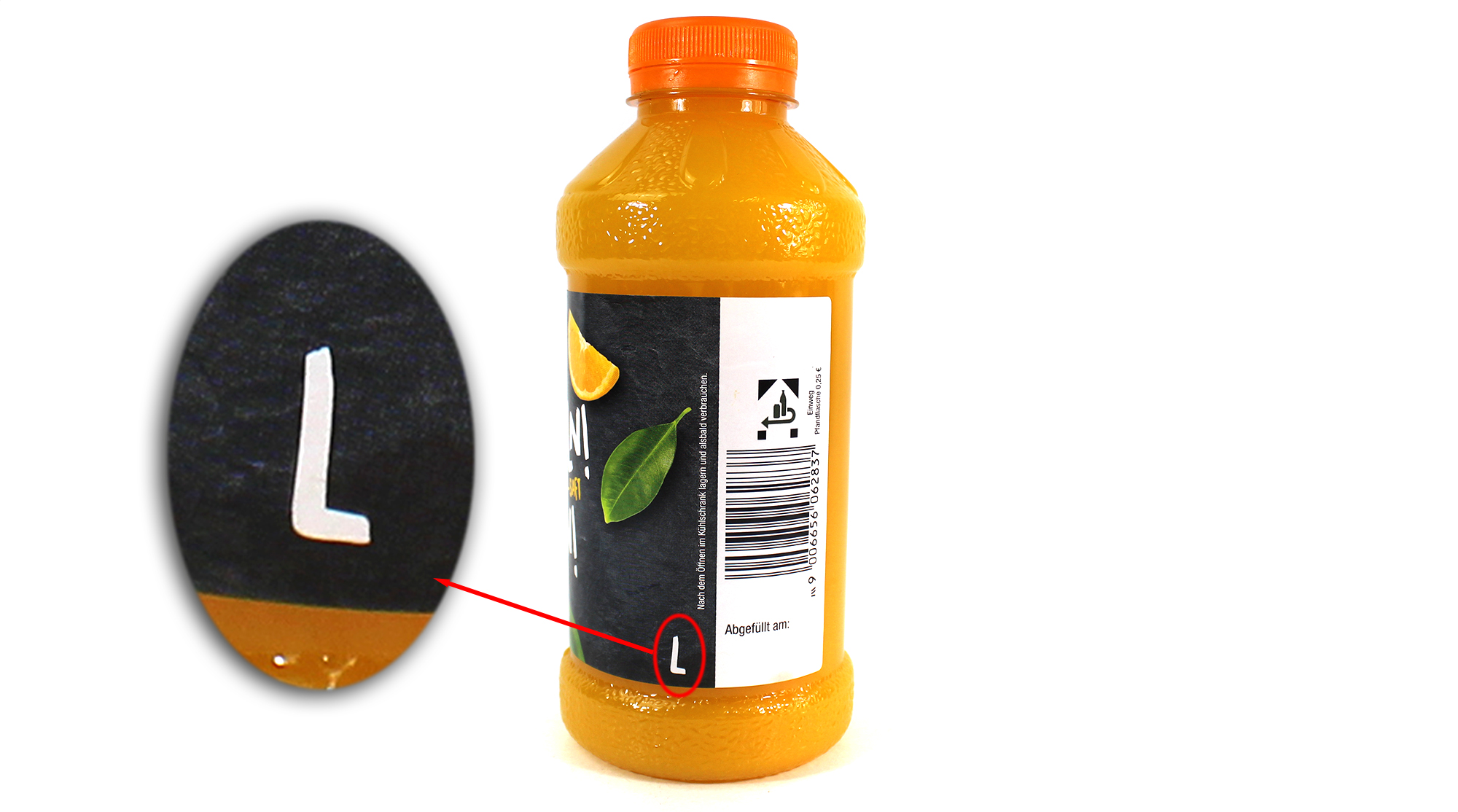 Edeka Südwest bietet in einigen Filialen Orangensaft zum Selberpressen an. Für die Abfüllung stehen drei Flaschengrößen zur Auswahl: XL, L und S, jeweils mit dem Preis pro Flasche. Auf dem Plakat gibt es keine Angabe zu den Füllmengen der jeweiligen Flaschengrößen und keine Angabe zum Grundpreis. Auf dem Etikett der Einwegflaschen stehen die Größen, in diesem Fall „L“, jedoch keine Angaben zu den Füllmengen.
