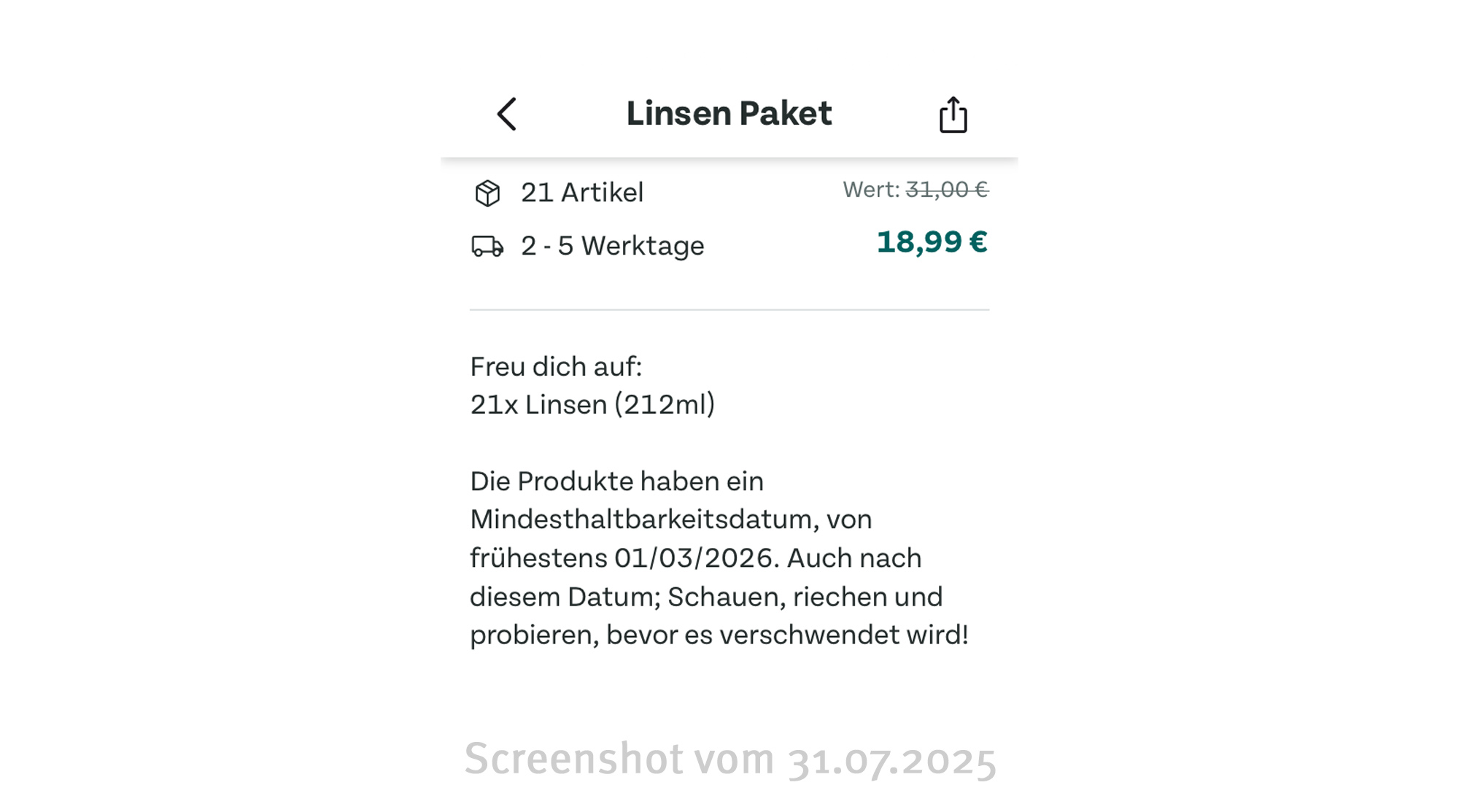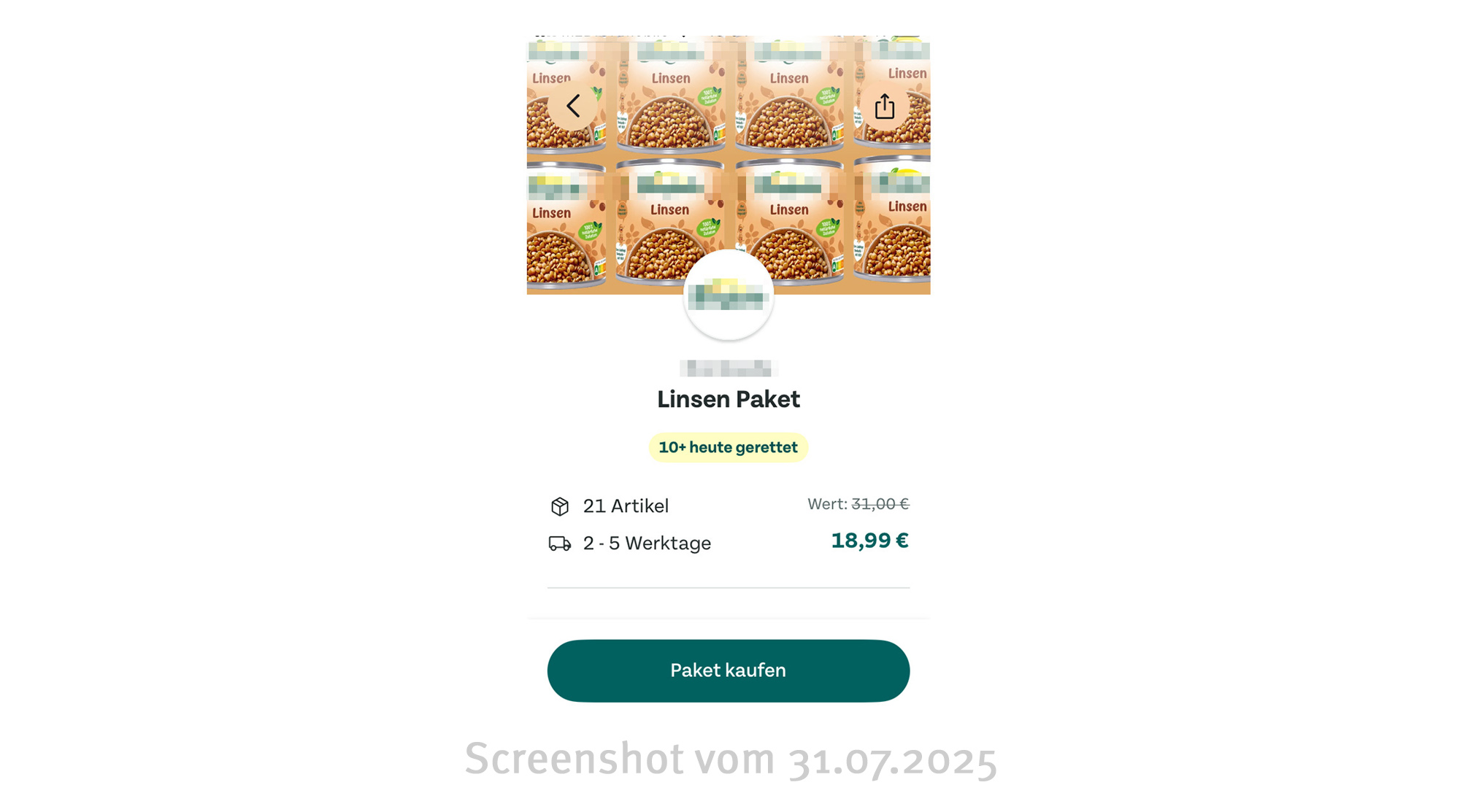 Über die App „Too Good To Go“ bietet der Händler ein wechselndes Angebot von Lebensmittelpaketen an. Es gibt Pakete, die aus unterschiedlichen Lebensmitteln bestehen, aber auch Angebote wie das „Linsen Paket“ vom 31. Juli 2025. Dieses enthält 21 Linsendosen à 212 Milliliter zum Preis von 18,99 Euro. Durchgestrichen ist der Preis von 31 Euro, der als „Wert“ gekennzeichnet ist.