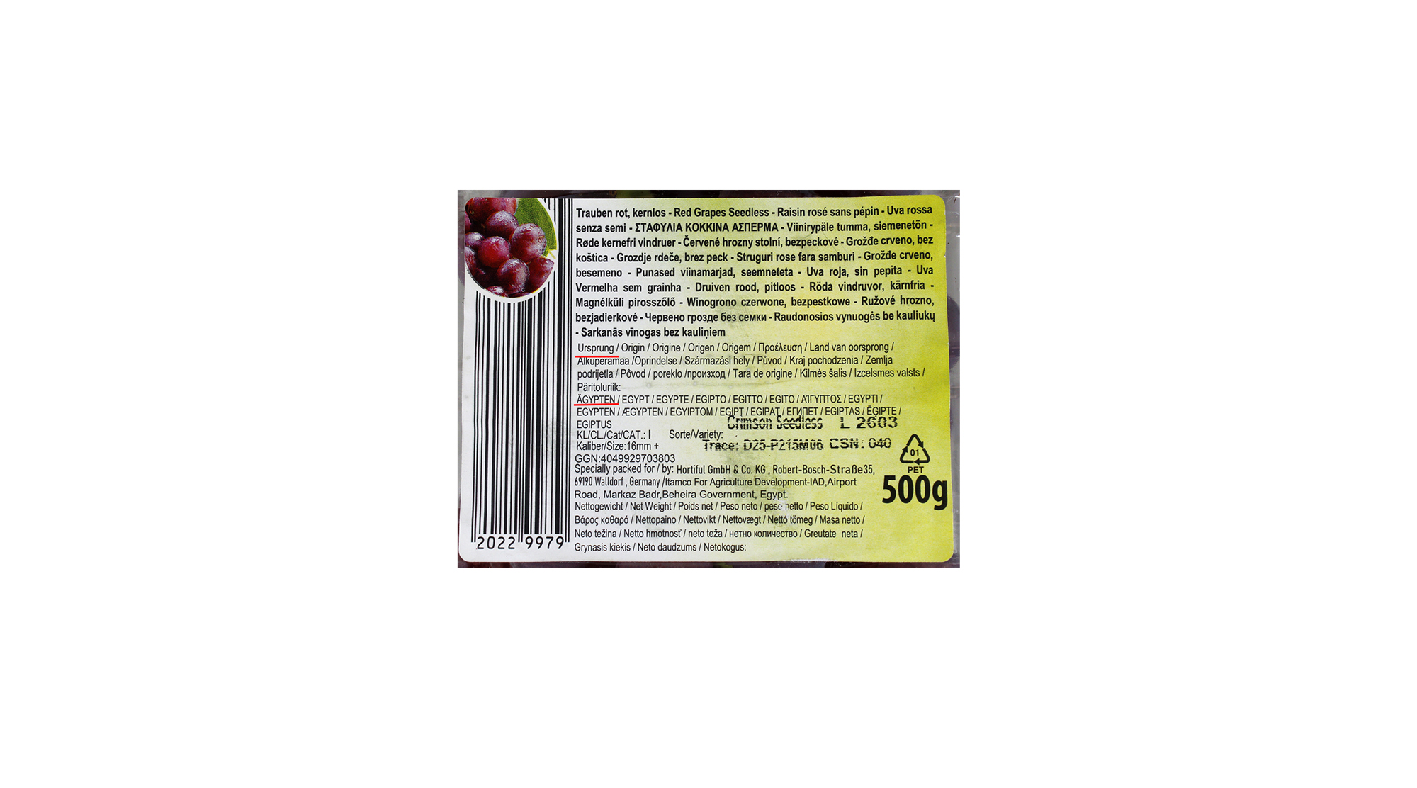 Die durchsichtige Kunststoffbox mit frischen roten Trauben des Anbieters Hortiful trägt auf dem Boden ein Etikett. Darauf stehen in jeweils 20 Sprachen als Fließtext, durch einen Schrägstrich getrennt, nacheinander aufgelistet die Bezeichnung „Trauben rot, kernlos“, das Wort „Ursprung“, „Ägypten“ und das Wort „Nettogewicht“. Mittig ist die Anbieteradresse aufgeführt sowie rechts unten sind ein Recyclingcode, „500 g“ und ein Aufdruck aus dem Hinweis „Crmson Seedless“ und mehreren Buchstaben- und Zahlenfolgen zu sehen.