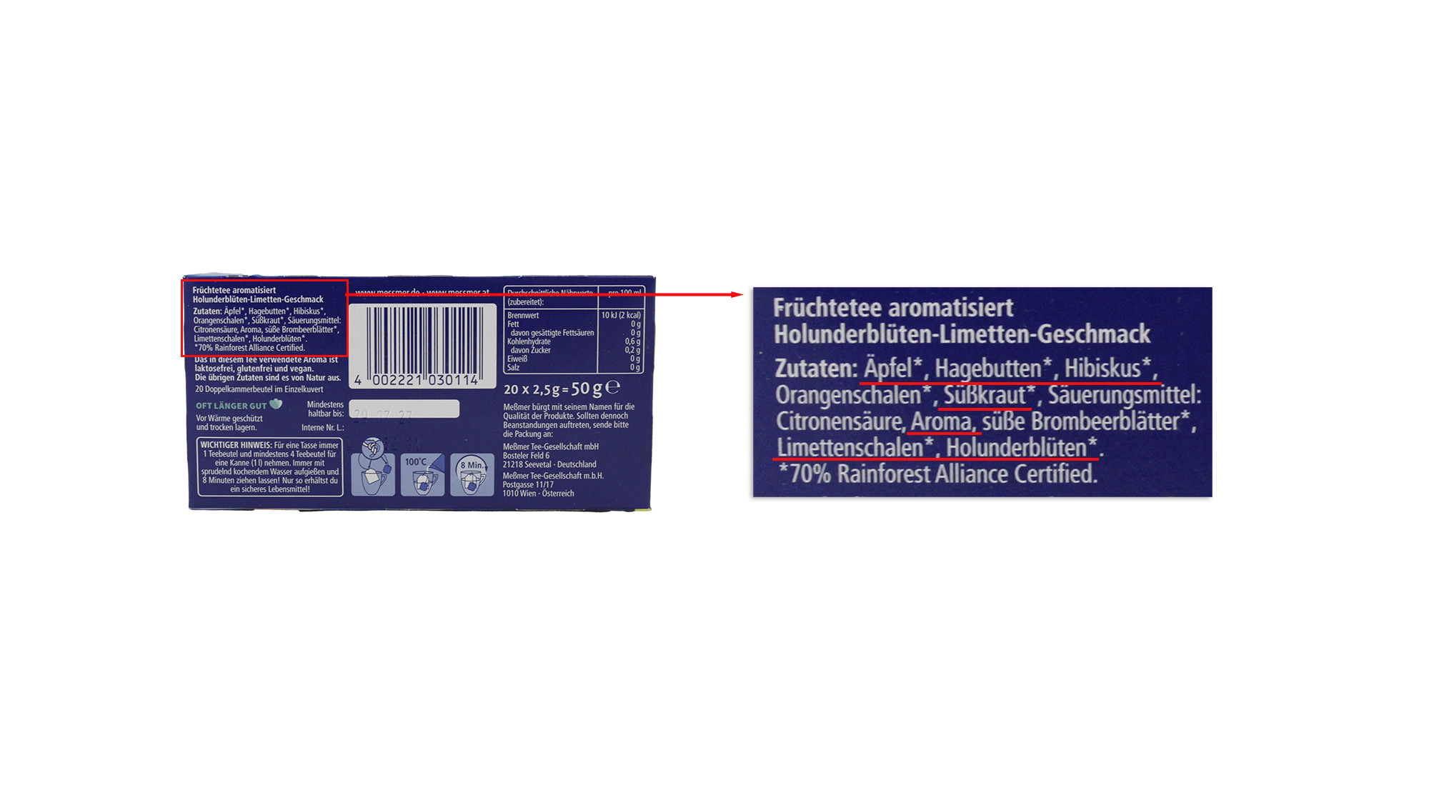 Die Schauseite bewirbt den Meßmer Früchtetee prominent mit „Holunderblüte Limette“ und ergänzt hierzu „spritzig-fruchtig“. Limetten und Holunderblüten tauchen jedoch erst an letzter Stelle in der Zutatenliste auf. Der Früchtetee besteht hauptsächlich aus Apfel, Hagebutten und Hibiskus. Weiterhin widerspricht die Aussage „spritzig-fruchtig“ dem tatsächlichen Geschmack, denn der Tee schmeckt unerwartet süß. Nur aus der Zutatenliste geht hervor, dass der Tee mit „Süßkraut“ gesüßt ist.