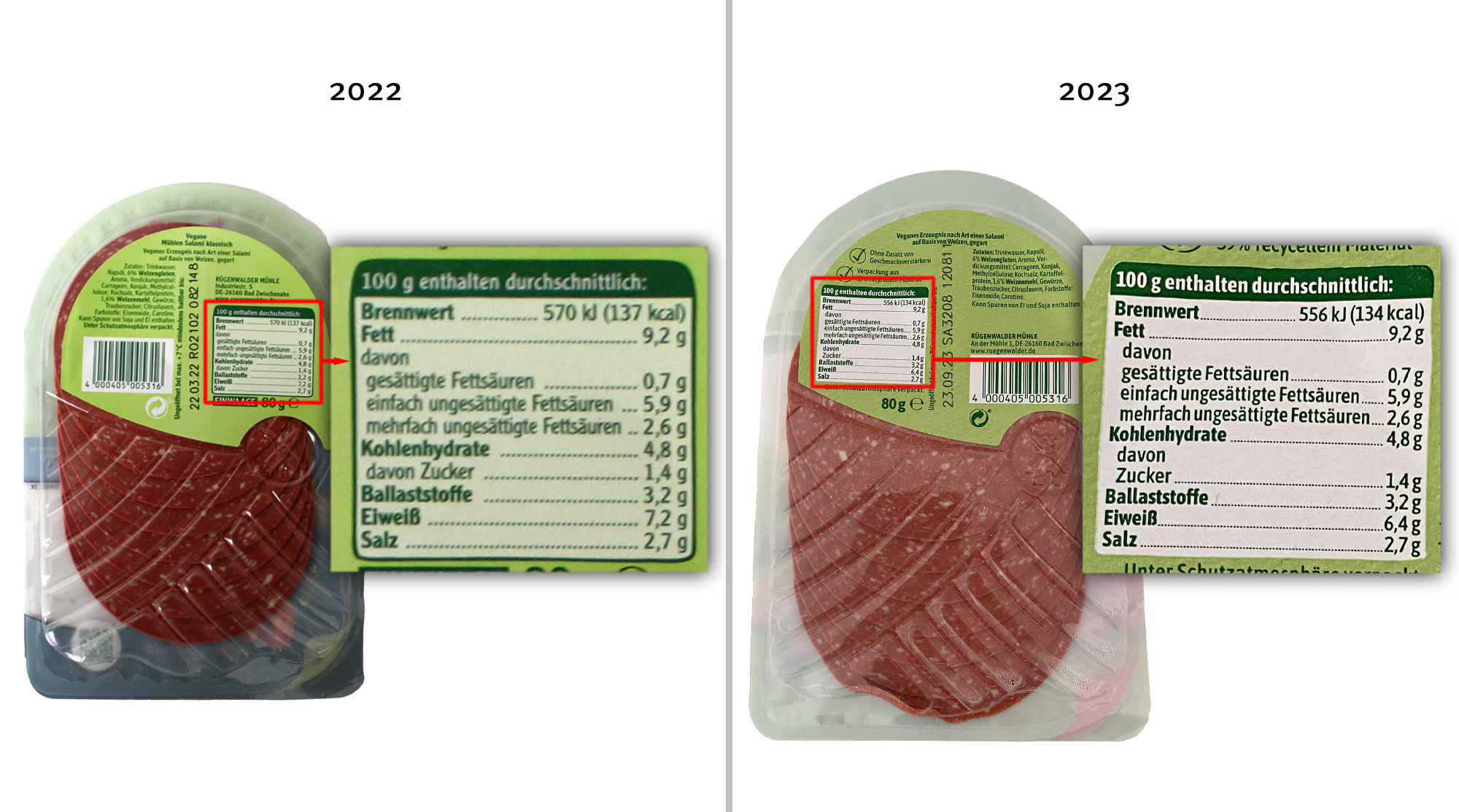 Lebensmittelklarheit hat 2023 im Rahmen eines Marktchecks den veganen Wurstersatz in geänderter Aufmachung im Handel gefunden. Der Hinweis „zuckerarm“ wurde entfernt. Der Hinweis „Proteinquelle“ steht weiterhin auf der Verpackung, obwohl der Proteingehalt sogar leicht gesunken ist.