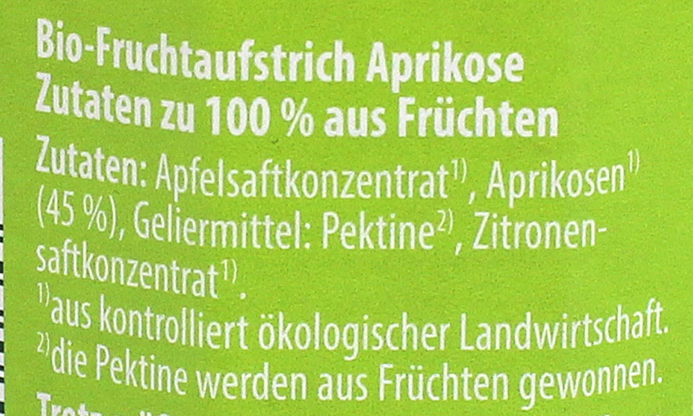 Es ist üblich, dass auf Fruchtaufstrichen der Fruchtanteil auf der Schauseite steht, denn er ist ein wesentliches Qualitätsmerkmal. Die Angabe „Zutaten zu 100 % aus Früchten“ können Verbraucherinnen und Verbraucher daher als Angabe des Fruchtanteils im Produkt verstehen. Dass mehr als die Hälfte des Aprikosenaufstrichs aus zuckerreichem Apfelsaftkonzentrat besteht, ist unserer Meinung nach nicht verständlich. Außerdem steckt mit Pektin ein Zusatzstoff im Aufstrich, der zwar aus Äpfeln isoliert werden kann, mit der ursprünglichen Frucht aber nicht mehr viel gemein hat.