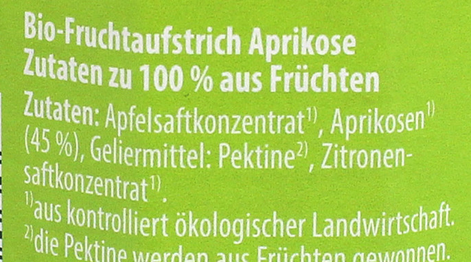 Somit besteht der Fruchtaufstrich zu 45 Prozent aus der Frucht Aprikose, enthält jedoch mehr Saftkonzentrat vom Apfel.