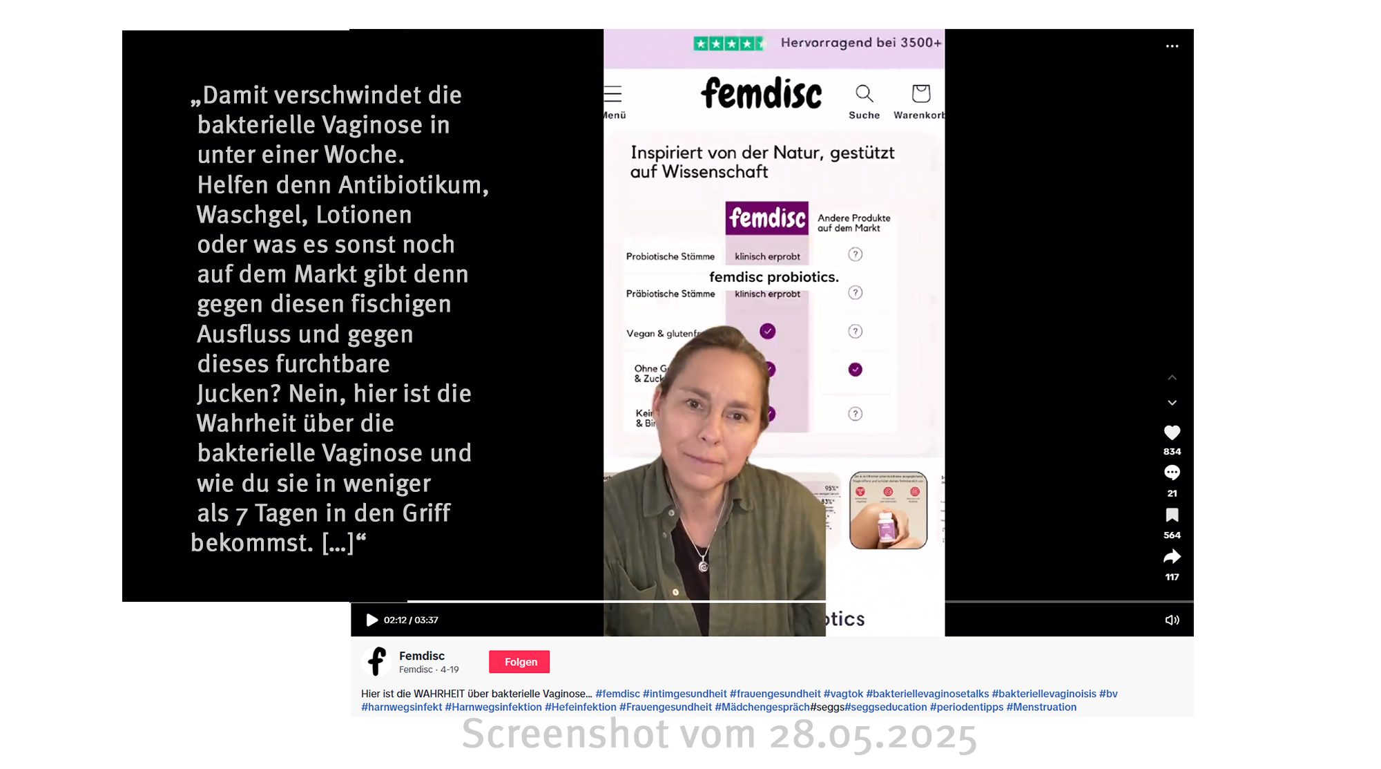 Die Firma Femdisc betreibt auf Tiktok einen Kanal mit Beiträgen zur Frauengesundheit. Der Titel eines Videos vom 19.04.2025 lautet: „Hier ist die Wahrheit über bakterielle Vaginose“. Der Beitrag enthält unter anderem folgenden Aussage: