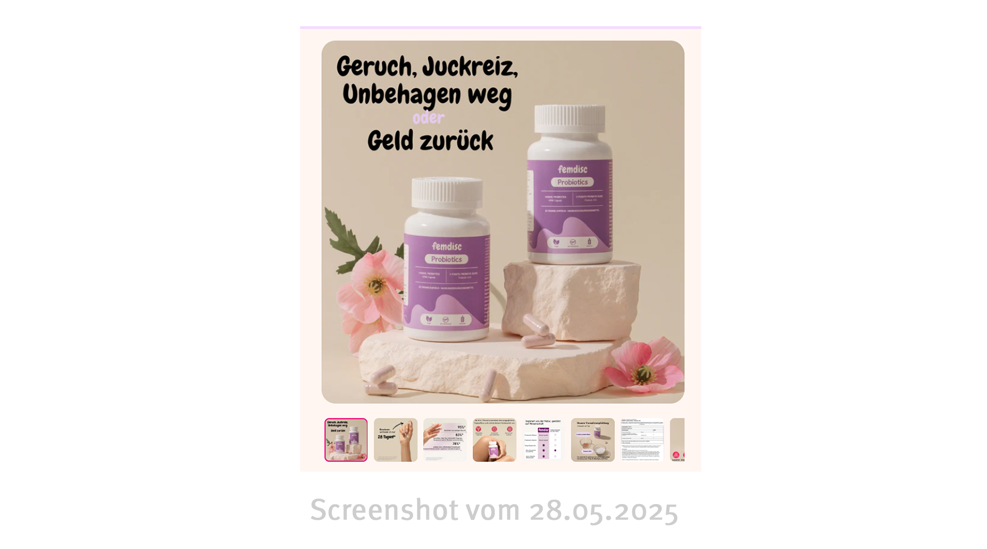 Ich bin auf eine Werbeanzeige gestoßen (ein Video). Es startet mit „Damit verschwindet die bakterielle Vaginose in unter einer Woche“. Ein absolutes Heilversprechen, dass es in unter 1 Woche diese Krankheit heilen kann. Es stellt sich jedoch leider heraus, dass die vermeintliche „Expertin“ (es wird auch nicht gesagt, ob das eine Ärztin ist oder welche Qualifikation die Dame hat) ein Produkt der Firma „femdisc“ verkauft. Es ist auch eine Anzeige der Firma, denn wenn man darauf klickt, landet man auf der Website der Firma „femdisc“. Die Produkte sind lediglich orale Probiotika (Nahrungsergänzungsmittel).