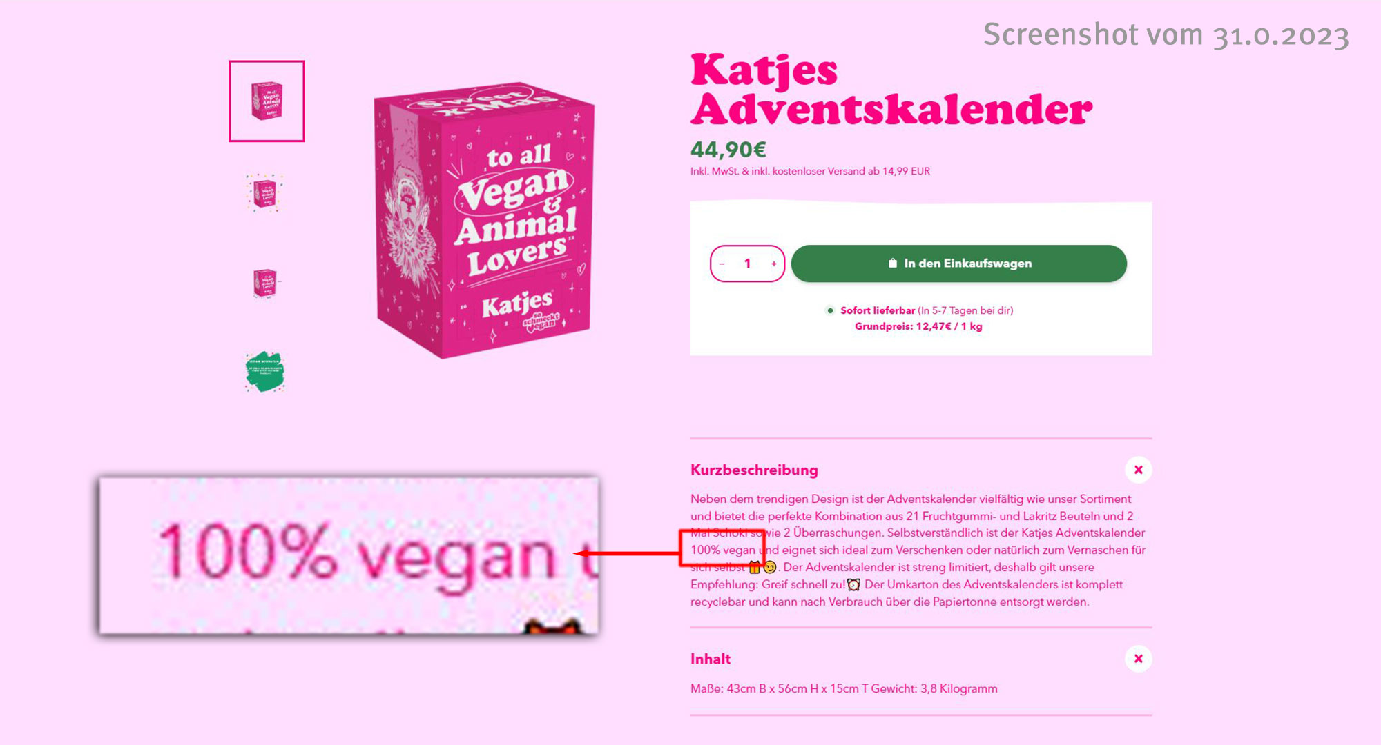 Die Bewerbung des Katjes-Adventskalenders als geeignet für „alle Vegan- und Tier-Liebhaber“ passt nicht. Bei dieser Aussage müssen alle Inhalte des Kalenders vegan sein, nicht nur die enthaltenen Lebensmittel.