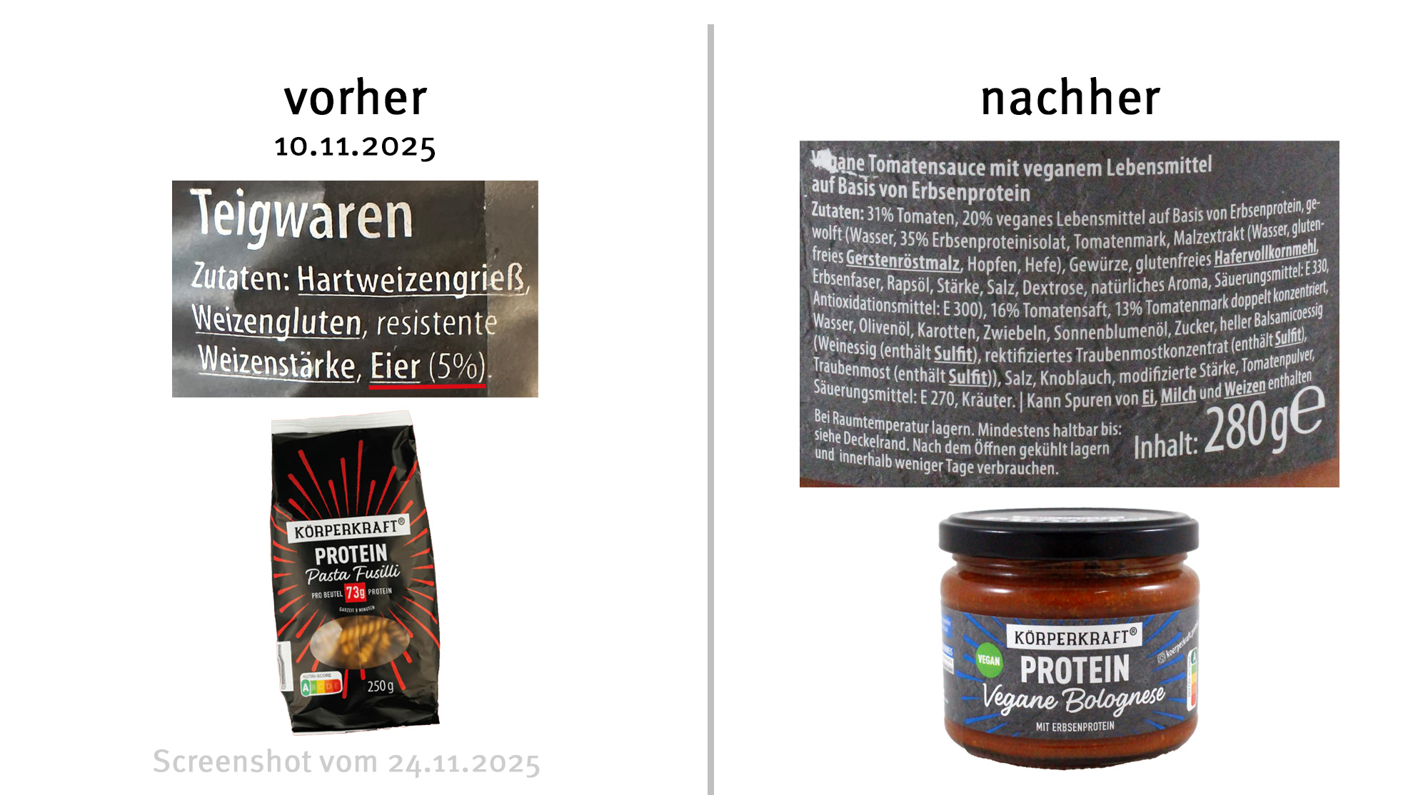 Die Verbraucherin hat im gelieferten Adventskalender entdeckt, dass im Türchen 10. Dezember die „Körperkraft Protein Pasta Fusilli“ stecken, die Eier enthalten. Die Verbraucherin hat den Kalender reklamiert.