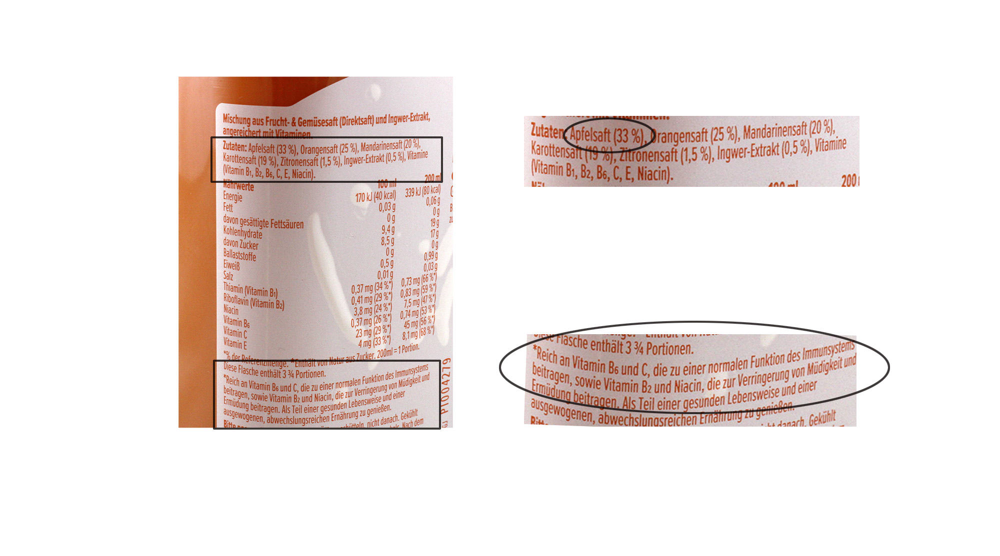 Auch die Immun-Werbung für den Saft auf der Schauseite passt nicht und ist halbherzig dargestellt: Statt sich eindeutig auf zugelassene Claims für einzelne Vitamine zu beschränken, setzt der Anbieter zahlreiche Sternchen auf das Etikett. Diese lassen sich kaum unterscheiden und sind schwer zuzuordnen. Auf der Schauseite wird nicht deutlich, dass lediglich die zugesetzten Vitamine B6 und C das Immunsystem unterstützen sollen.