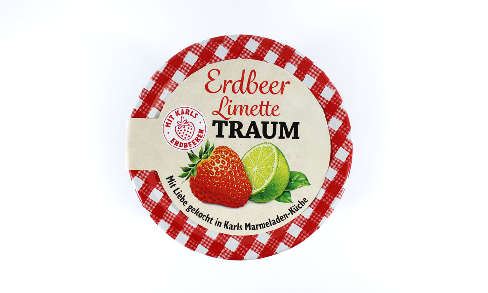 Der Produktname auf dem Deckel des Glases lautet „Erdbeer-Limette-Traum“. Neben dem Namen zeigt das Etikett eine Erdbeere und eine aufgeschnittene Limette. Des Weiteren wirbt das Etikett „mit Liebe gekocht in Karls Marmeladen-Küche“. Die Bezeichnung auf dem Bodenetikett des Glases lautet: „Erdbeer-Fruchtaufstrich mit Limettengeschmack“. Die Zutatenliste führt neben Erdbeeren Zucker und Geliermittel, Säuerungsmittel, Konservierungsstoff, Aroma sowie Zitronensaft aus Zitronensaft-Konzentrat auf.