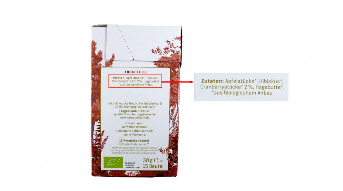 Der Produktname passt nicht zur Zusammensetzung. Bei dem Produktnamen “Früchtetee Kanadische Cranberry“ und der Gestaltung der Verpackung müssen Verbraucher:innen nicht mit einem Früchtetee rechnen, der hauptsächlich aus Apfel und Hibiskus und nur zu zwei Prozent aus Cranberry besteht.