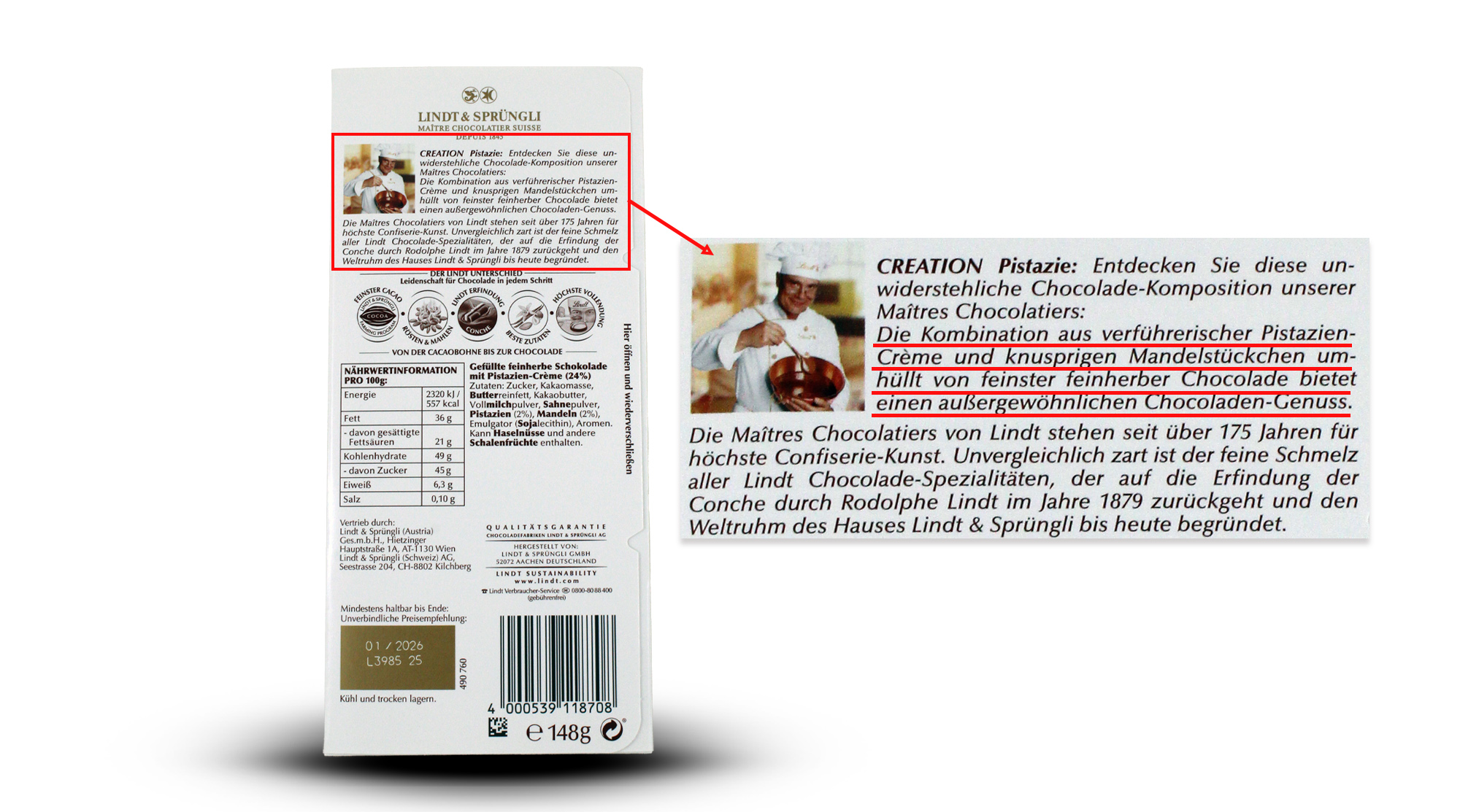 Die „Lindt Creation“ vermittelt eine besonders hohe Qualität mit wertgebenden Mengen Pistazien und Mandeln in der Schokolade. Das widerspricht jedoch der tatsächlichen Zusammensetzung. Das verärgert Verbraucher:innen zur Recht, insbesondere, wenn die Mengen der beworbenen Zutaten erst in der Zutatenliste erscheinen. Der Geschmack der Schokolade wird wesentlich auf die enthaltenen Aromen zurückzuführen sein.