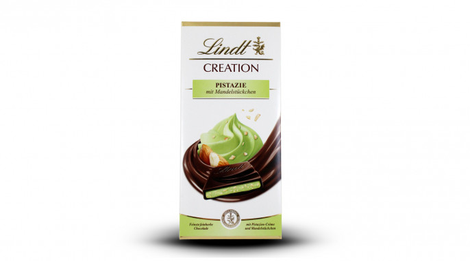 Lindt bewirbt die Schokolade „Creation Pistazie mit Mandelstückchen“ auf der Schauseite als „Feinste feinherbe Chocolade mit Pistazien-Creme und Mandelstückchen“. Laut Zutatenliste stecken in der Tafel aber gerade einmal zwei Prozent Pistazien und zwei Prozent Mandeln. Das passt nicht zur Aufmachung der Verpackung, die deutlich höhere Mengen erwarten lässt.