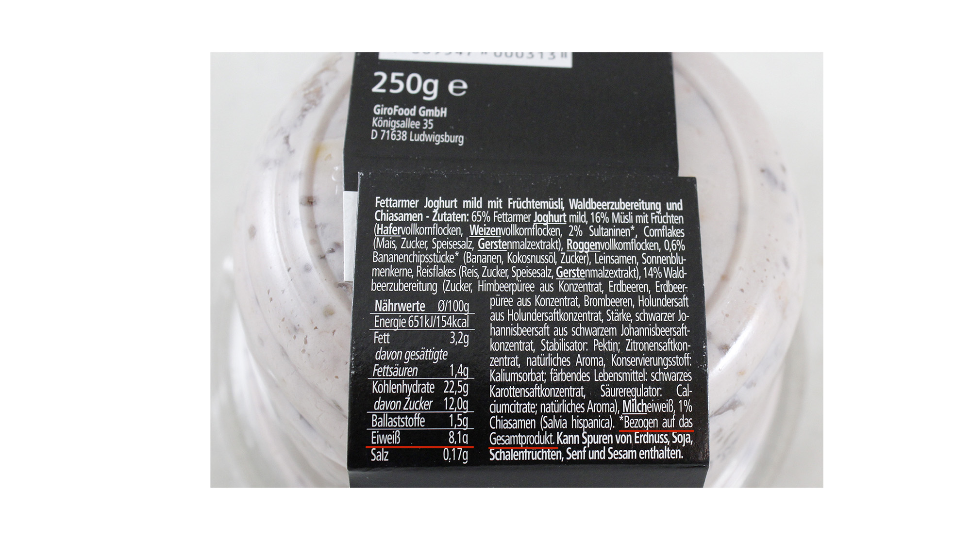 Voll daneben: Die beworbene Proteingehalt auf dem Deckel passt nicht zum Eiweißgehalt in der Nährwerttabelle. Dazu kommt, dass es sich bei der isolierten Angabe um eine unzulässige Wiederholung eines Nährwerts handelt.