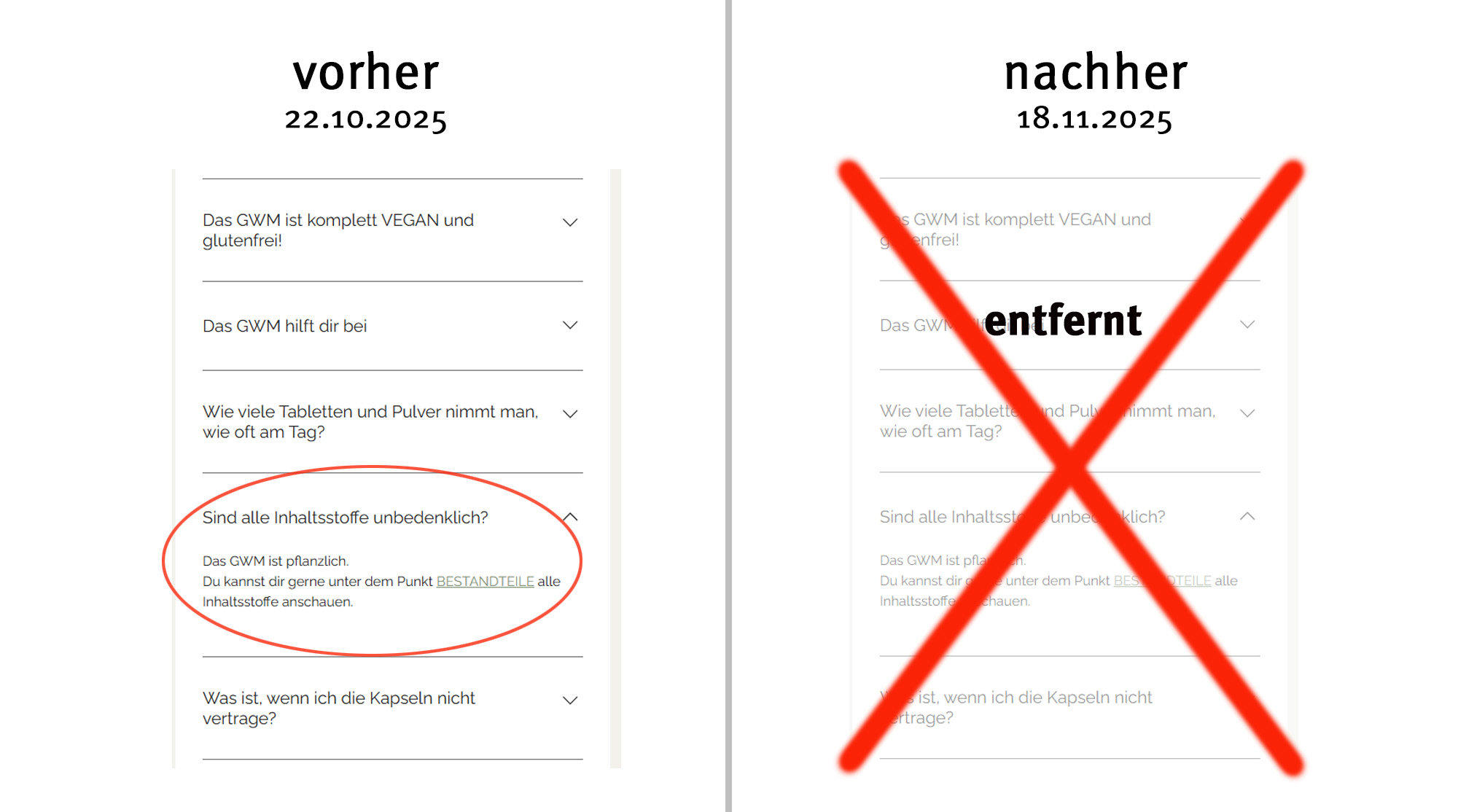 Die Hinweise „vegan“ und „pflanzlich“ auf der Website passen nicht, wenn ein Teil der angebotenen Produkte tierische Zutaten wie Gelatine oder Kollagen enthalten.