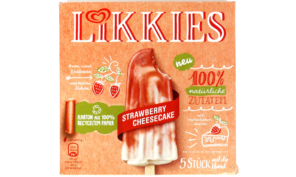Kürzlich habe ich das "Strawberry Cheesecake"-Eis von Likkies gekauft. Auf der Verpackung stand "100 % natürliche Zutaten". Nun ist mir beim Lesen der Zutatenliste aufgefallen, dass dort Zusatzstoffe wie Emulgatoren, Stabilisatoren und Aroma enthalten sind! Das sind für mich keine "natürlichen Zutaten"! Hätte ich das vorher gelesen, hätte ich das Eis nicht gekauft. Für mich ist das Verbrauchertäuschung.