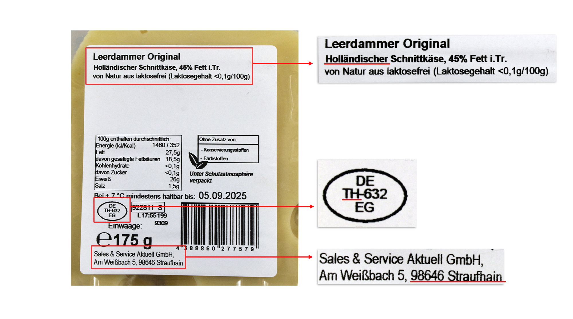 Auf der Schauseite weist der Produktname „Leerdamer Original“ als bekannter holländischer Käse auf die Niederlande als Herkunftsort hin. Die Bezeichnung auf der Rückseite „Holländischer Schnittkäse“ verstärkt die Erwartung, dass der Käse aus Holland stammt. Das Identitätskennzeichen und die Firmenadresse auf der Rückseite verweisen jedoch auf Thüringen.