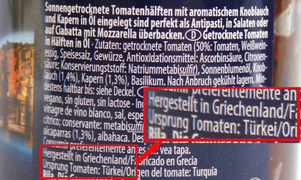 Das Etikett auf dem Glas sowie die Aufmachung der Website leverno.de deuten auf getrocknete Tomaten aus Italien hin. Verbraucher haben keinen Anlass, dies zu bezweifeln, zumal Verbraucher Italien als typisches Herkunftsland für Tomaten kennen. Aus unserer Sicht sind die Tomaten als primäre Zutat anzusehen. Dies verpflichtet den Hersteller auf eine abweichende Herkunft der Tomaten hinzuweisen. Der Hinweis auf die Herkunft Türkei für die Tomaten sowie auf die Herstellung in Griechenland reicht hierfür aus unserer Sicht jedoch nicht aus. Er erfolgt erst auf der Rückseite und direkt hinter der spanischsprachigen Zutatenliste. Weder Schriftgröße noch Schriftart setzen sich dabei von der Zutatenliste ab. Den Hinweis können Verbraucher leicht übersehen.