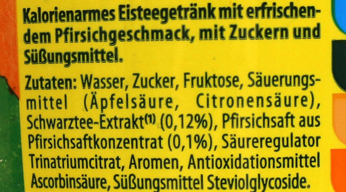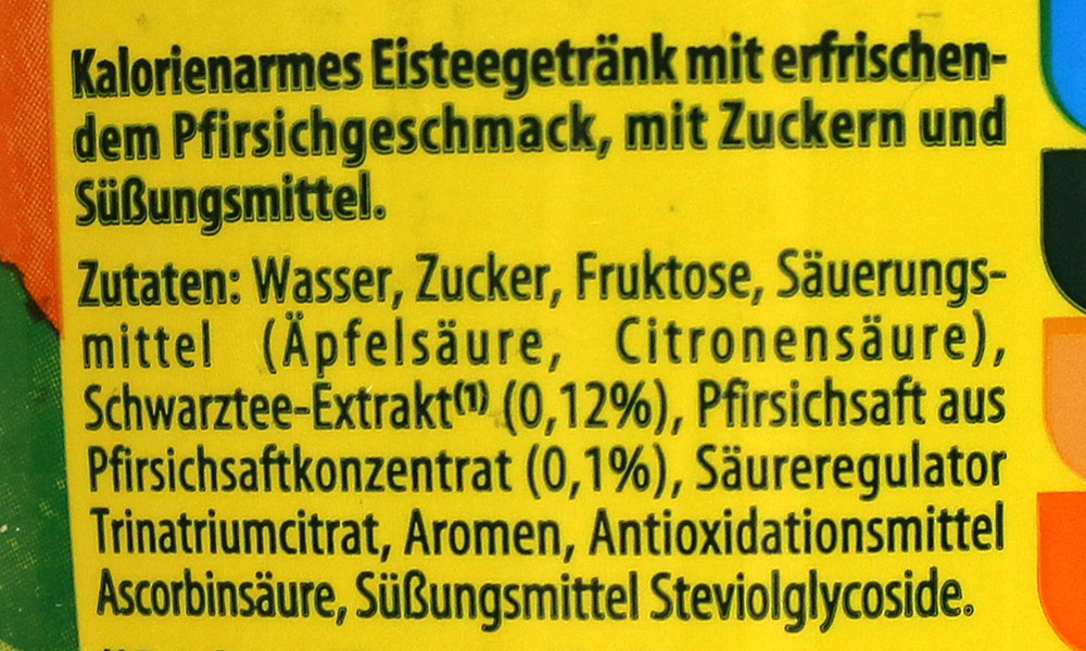Die Bezeichnung auf der Rückseite lautet „Kalorienarmes Eisteegetränk mit erfrischendem Pfirsichgeschmack, mit Zuckern und Süßungsmitteln“. Laut Zutatenliste beträgt der Pfirsichanteil im Getränk 0,1 Prozent. Es handelt sich dabei um „0,1 Prozent Pfirsichsaft aus Pfirsichsaftkonzentrat“. Neben weiteren Zutaten führt die Zutatenliste „Aromen“ auf.