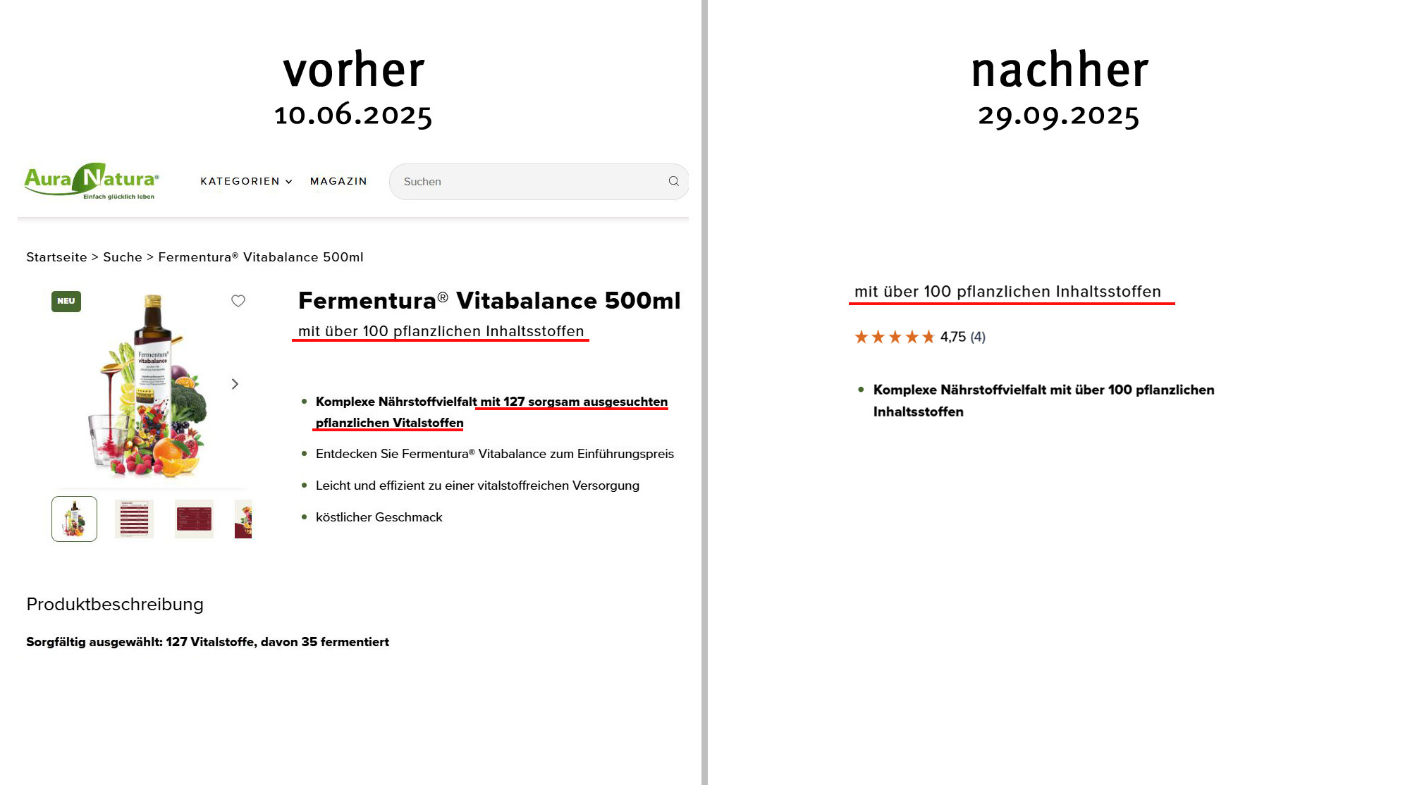 Im Online-Shop warb die Firma Auranatura mit „127 Vitalstoffen“ für das Produkt „Fermentura Vitabalance“. Im Zutatenverzeichnis dagegen standen mit 66 Zutaten gerade mal die Hälfte.