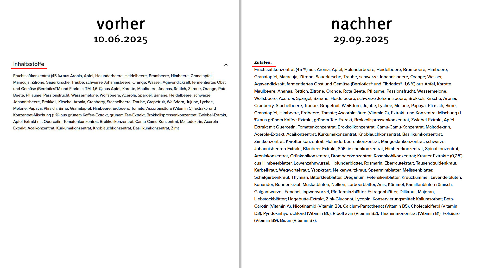 Der Online-Shop zeigt nun ein umfangreiches Zutatenverzeichnis. Die Anzahl der beworbenen „Vitalstoffe“ stimmt mit der Zutatenliste aber immer noch nicht richtig überein.