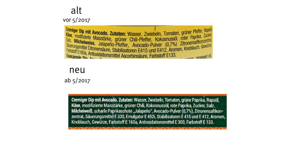 Der Produktname „Guacamole“ weist auf einen Dip mit Avocadofruchtfleisch als Hauptzutat hin. Wenn statt Fruchtfleisch nur Minimengen Avocadopulver sowie Aromen und Farbstoffe für die Guacamole verwendet werden, können sich Verbraucher getäuscht sehen. Der Produktname Guacamole passt nicht zur Aufmachung des Dips, der lediglich 0,7 Prozent Avocadopulver sowie Aromen und Farbstoffe enthält.