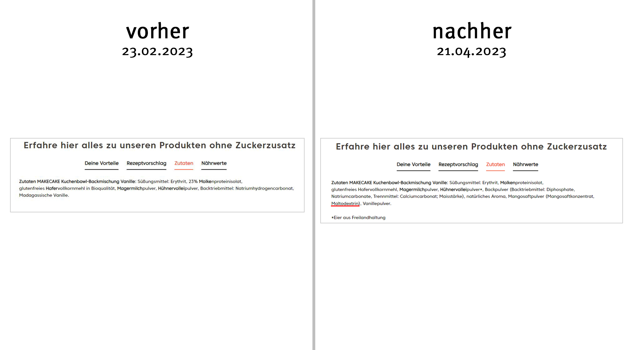 Die Zutatenliste der „Kuchenbowl Backmischung Vanille“ auf der Verpackung unterscheidet sich an mehreren Stellen von der Zutatenliste auf make-cake.de. Die Verpackung listet als Zutat beispielweise „Mangosaftpulver (Mangosaftkonzentrat, Maltodextrin)“ auf. Auf der Webseite ist diese Zutat oder ihre Einzelzutaten „Mangosaftkonzentrat“ und „Maltodextrin“ dagegen nicht aufgeführt.
