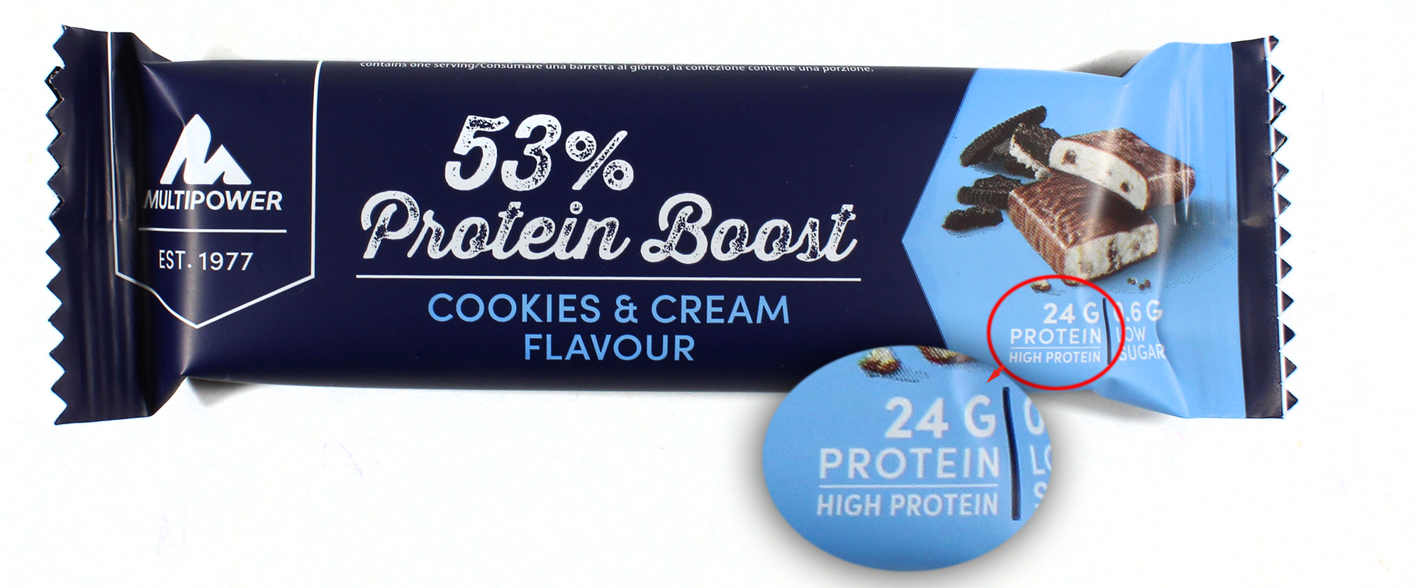Auf der Schauseite des Proteinriegels sind neben dem Marken- und dem Produktnamen „53 % Protein Boost Cookies & Cream Flavour“ die Angaben „24 G High Protein“ sowie „0,6 G Low Sugar“ aufgedruckt. Eine Bezugsgröße zu den Werten fehlt. Die Nährwerttabelle unter der Falz auf der Rückseite zeigt einen Proteingehalt von 53 Gramm Eiweiß pro 100 Gramm. In der zweiten Spalte der Nährwerttabelle ist der Eiweißgehalt von 24 Gramm pro Riegel von 45 Gramm genannt.