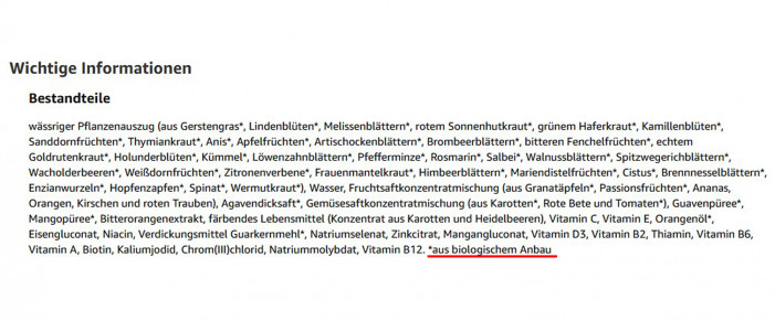 Mit übertriebenen Aussagen zur Qualität und Zusammensetzung bewirbt der Online-Händler das Produkt „Vital“. So soll das Konzentrat „66 Vitalstoffe“ enthalten, wobei nicht klar wird, was damit gemeint ist. Auch der Hinweis auf eine „tägliche Rundumversorgung“ ist für ein Nahrungsergänzungsmittel unverständlich, wenn mehrere Vitamine und Mineralstoffe in der Nährwerttabelle fehlen. Auch die Bio-Werbung ist anhand der Packungsangaben nicht nachvollziehbar.