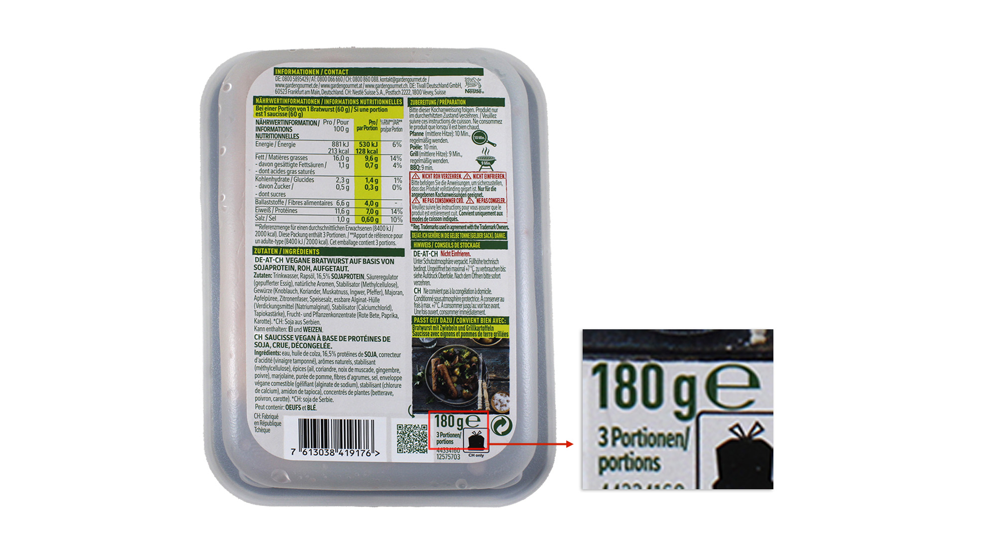 Die Verpackung des Produkts „Garden Gourmet Sensational Bratwurst aus Sojaprotein“ ist auf der Schauseite mit einem Sichtfenster versehen. Dort sind drei Bratwürste nebeneinander sichtbar. Eine weitere Bratwurst ist als zubereitete Bratwurst abgebildet, verdeckt jedoch den Blick auf das gesamte Sichtfenster. Es kann der Eindruck entstehen, dass darunter eine vierte Bratwurst liegt. Die Rückseite der Verpackung ist nicht durchsichtig, sondern cremefarben. Zusammen mit dem nahezu ganzseitigen Etikett auf der Rückseite lässt sich der tatsächliche Inhalt nur schwer erkennen. Auf dem Etikett findet sich rechts unten mit „180 g, 3 Portionen“ die Füllmengenangabe.