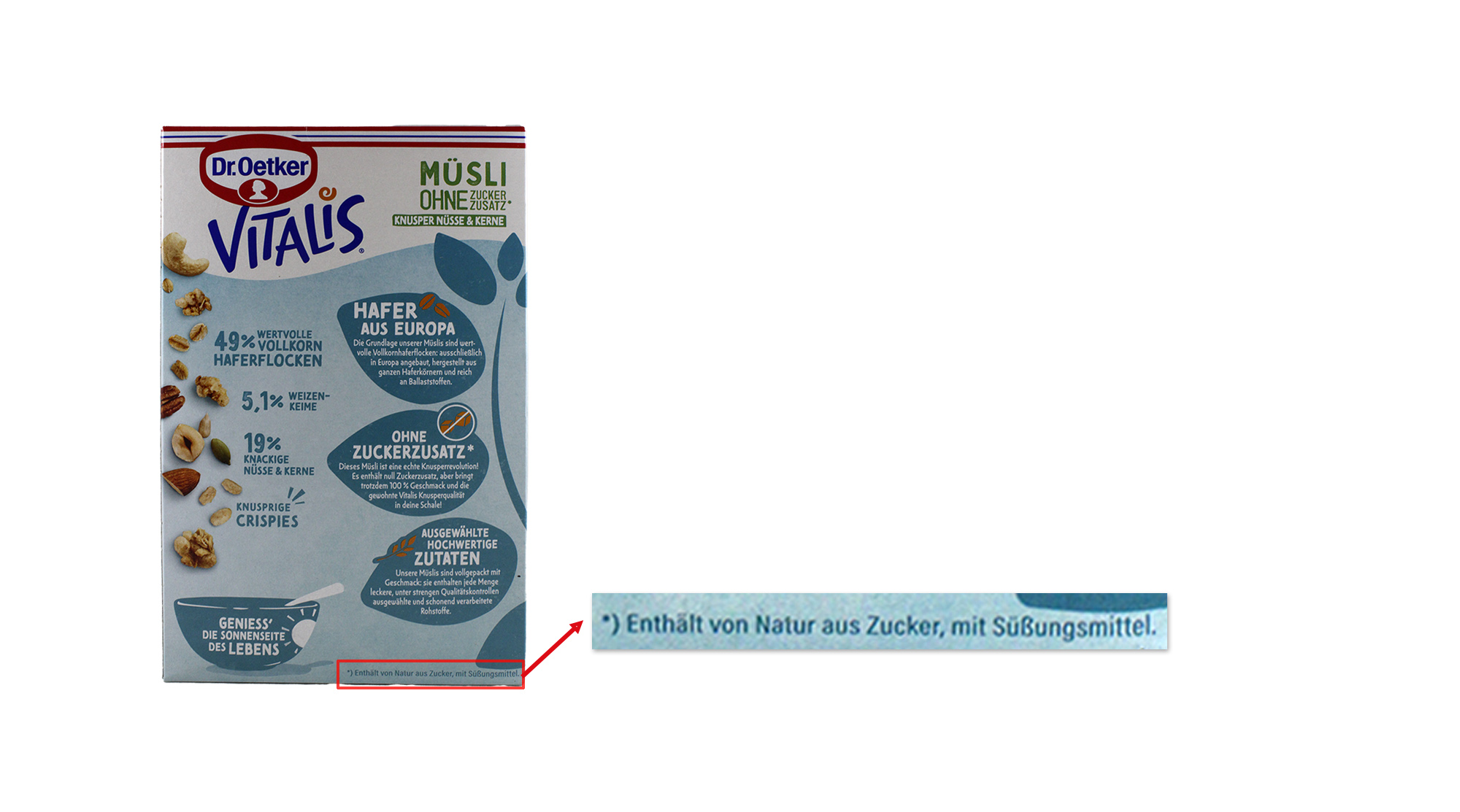 Auf der Schauseite der Vitalis-Packung von Dr. Oetker steht in Großbuchstaben „Müsli ohne Zuckerzusatz“. Weitere, gut lesbare Angaben sind „Null Zuckerzusatz* – 100 % Knuspergenuss!“ sowie „Knusper Nüsse & Kerne“. Kleingedruckt am unteren Rand der Packung steht die Auflösung des Sternchenhinweises „Enthält von Natur aus Zucker, mit Süßungsmittel“. Auf der Rückseite finden sich weitere Werbehinweise unter anderem auf die Zusammensetzung: „49 % wertvolle Vollkornhaferflocken, 5,1 % Weizenkeime, 19 % knackige Nüsse & Kerne“. Am unteren Rand findet sich wie auf der Schauseite kleingedruckt der Hinweis auf die Sternchenauflösung.