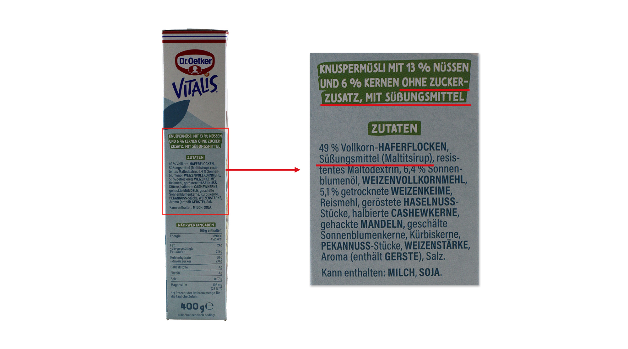 Dass Dr. Oetker auf Zucker verzichtet, ist auf der Packung auf den ersten Blick erkennbar. Dennoch ist das „Vitalis Müsli Knusper Nüsse & Kerne“ gesüßt. Es enthält das Süßungsmittel Maltitsirup, was erst im Zutatenverzeichnis deutlich wird. Die kleingedruckten Hinweise auf Süßungsmittel sind nach Ansicht von Lebensmittelklarheit allesamt geradezu versteckt.