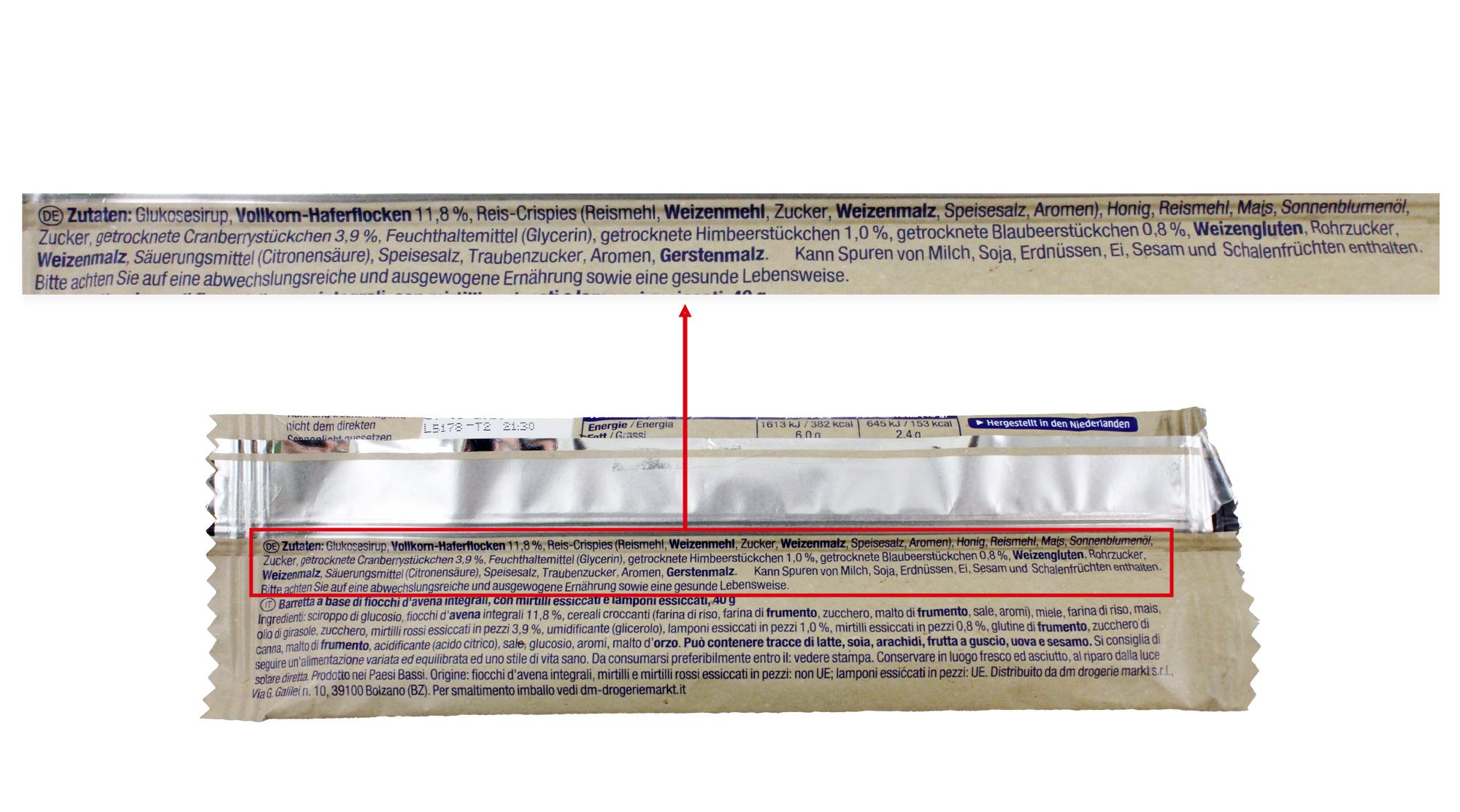 Auf der Schauseite des dm Riegels „Sportness Natural Energy“ sind ein halber Riegel und ein paar Beerenfrüchte abgebildet. Darunter steht der Hinweis „Riegel mit Vollkorn-Haferflocken, Cranberries, Himbeeren und Blaubeeren“. Die aufgezählten natürlichen Zutaten machen zusammen 17,5 Prozent der Zutaten aus. Als weitere natürliche Zutaten tauchen Honig, Mais, Sonnenblumenöl und Speisesalz auf. An erster Stelle steht Glukosesirup. Ansonsten nennt die Zutatenliste weitere Zuckerarten, helle Mehle, Weizengluten, Weizenmalz, Zusatzstoffe und Aromen.